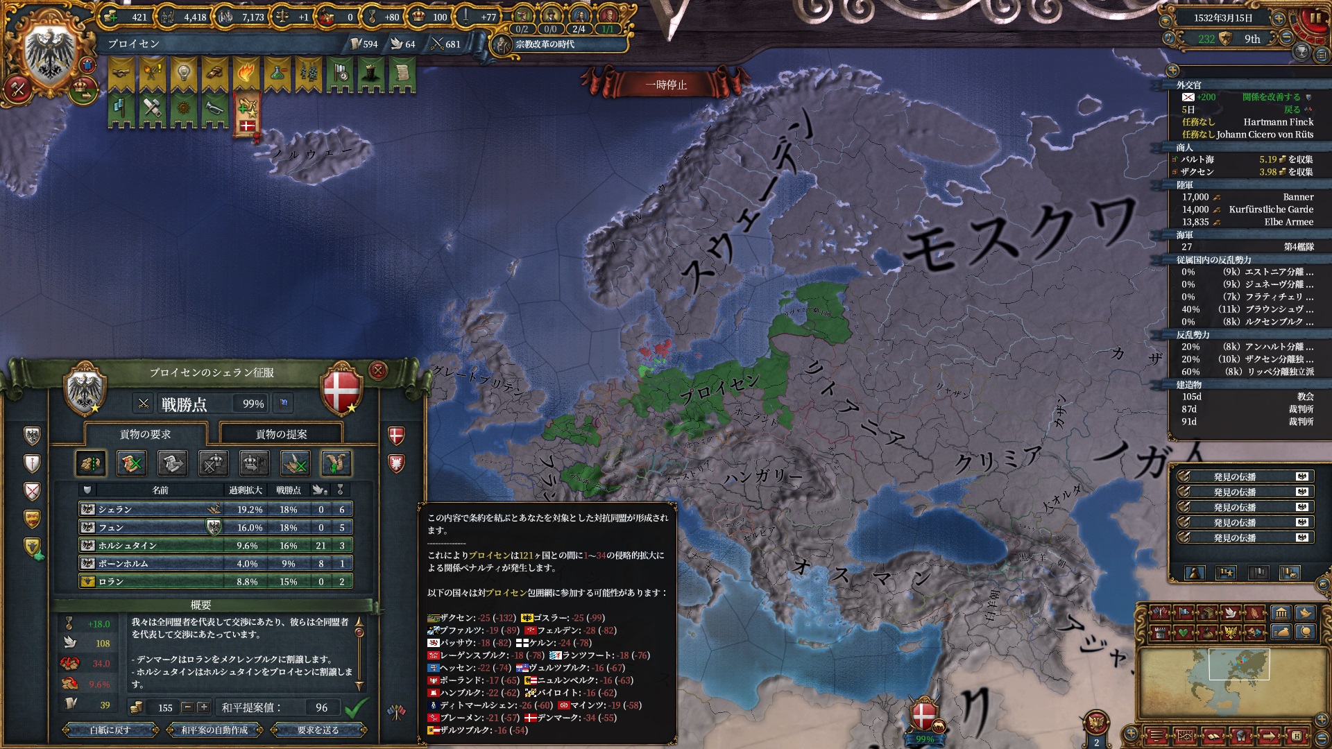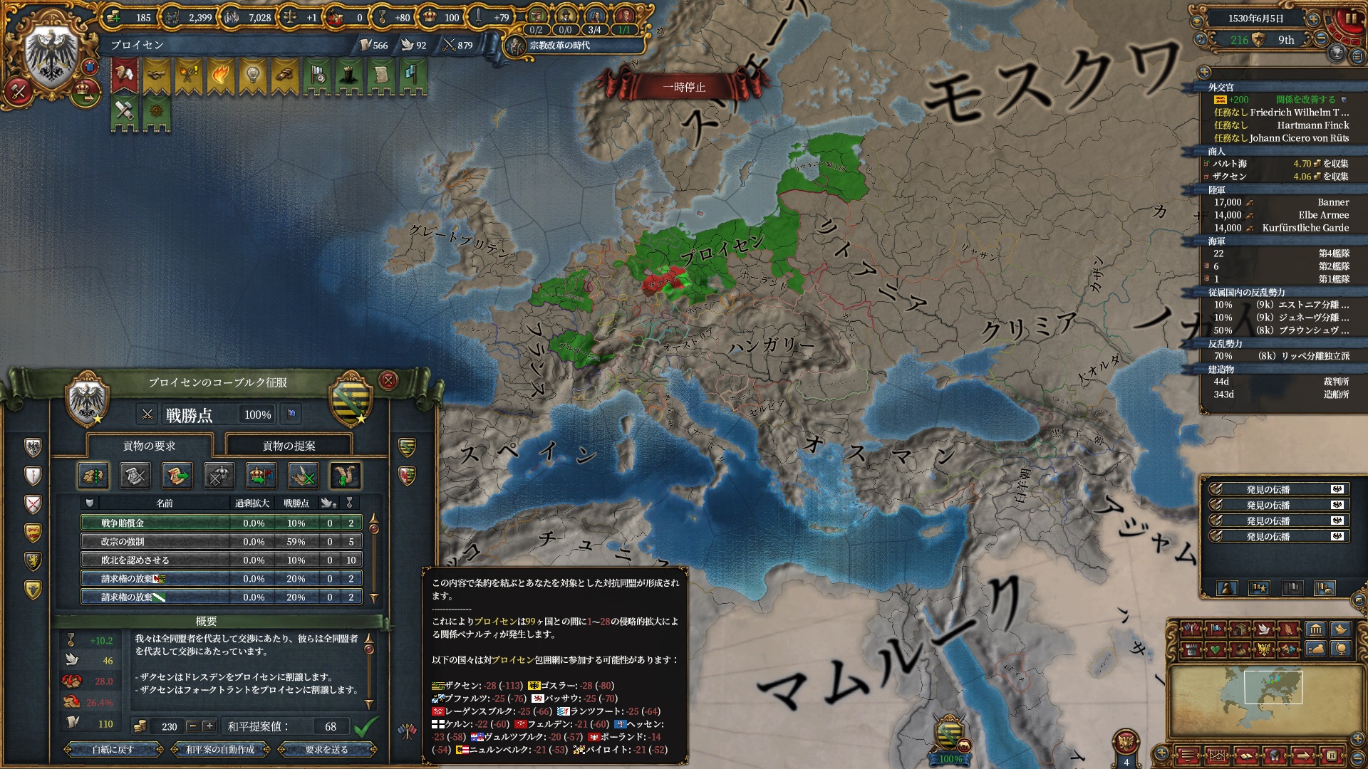 早速のデンマーク領の回復。イギリスが付いてきますが、モスクワとプロイセンが闊歩してる大陸に来ることは無いです。