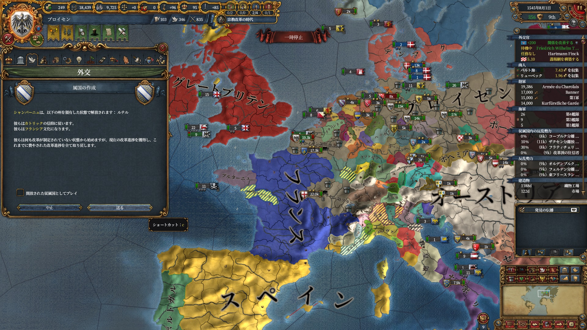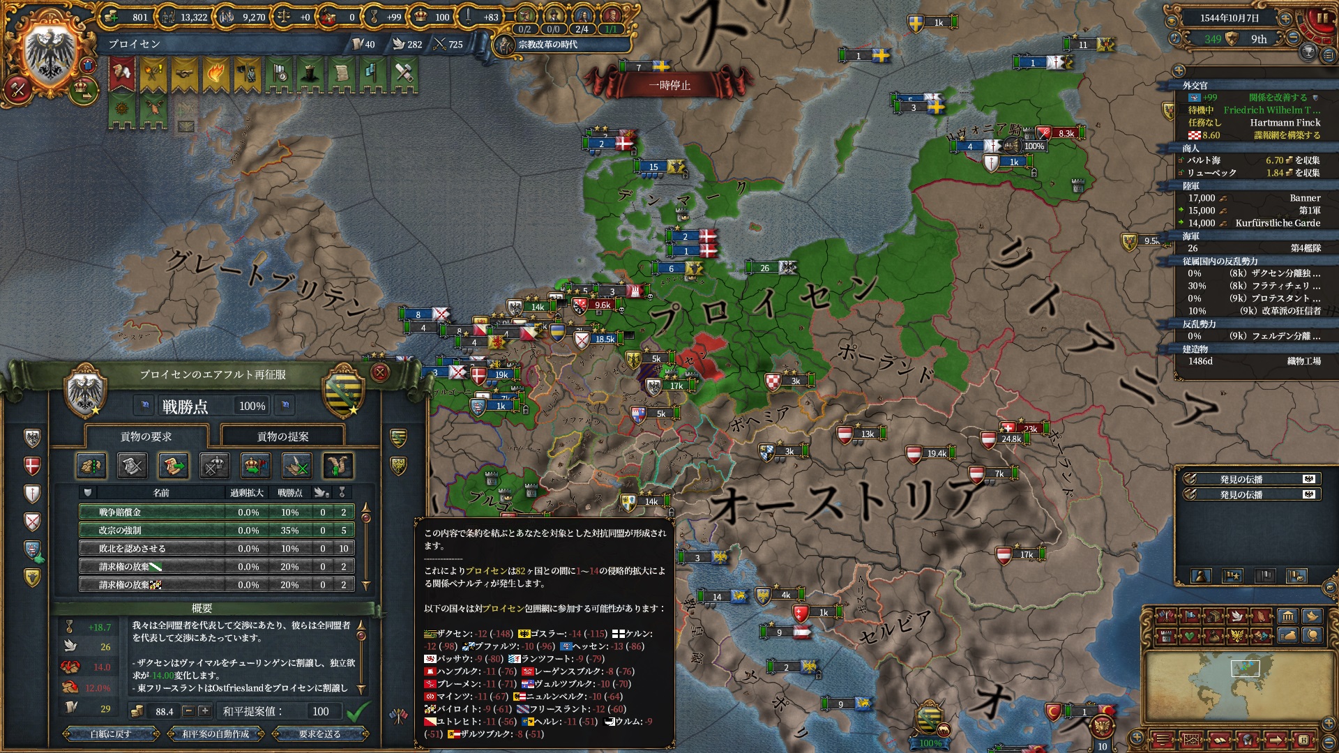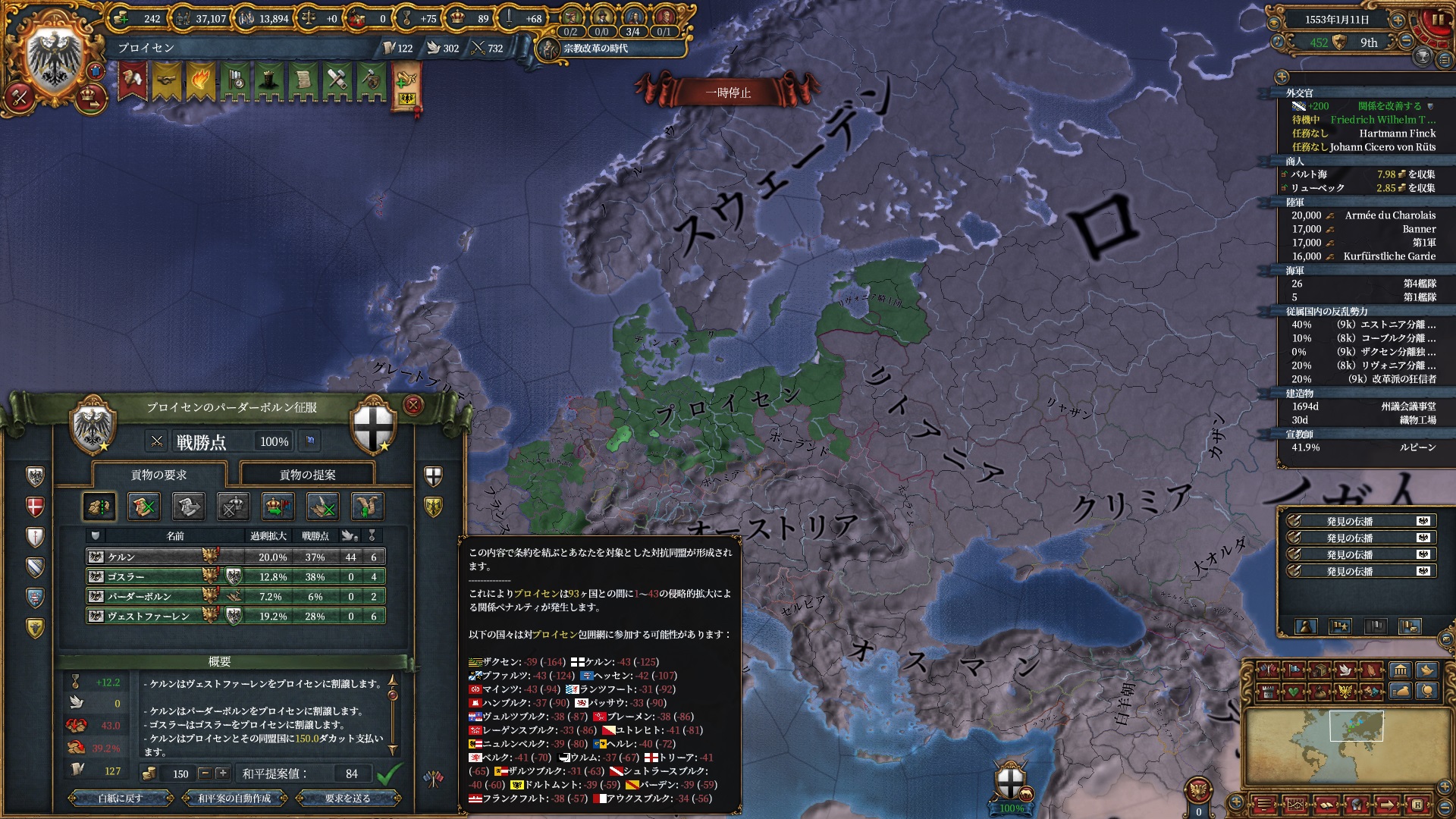 主戦国は仕方がないですが、共戦国は改宗の強制でプロテスタントに変えていき、後々カトリックではない状態で併合を狙います。