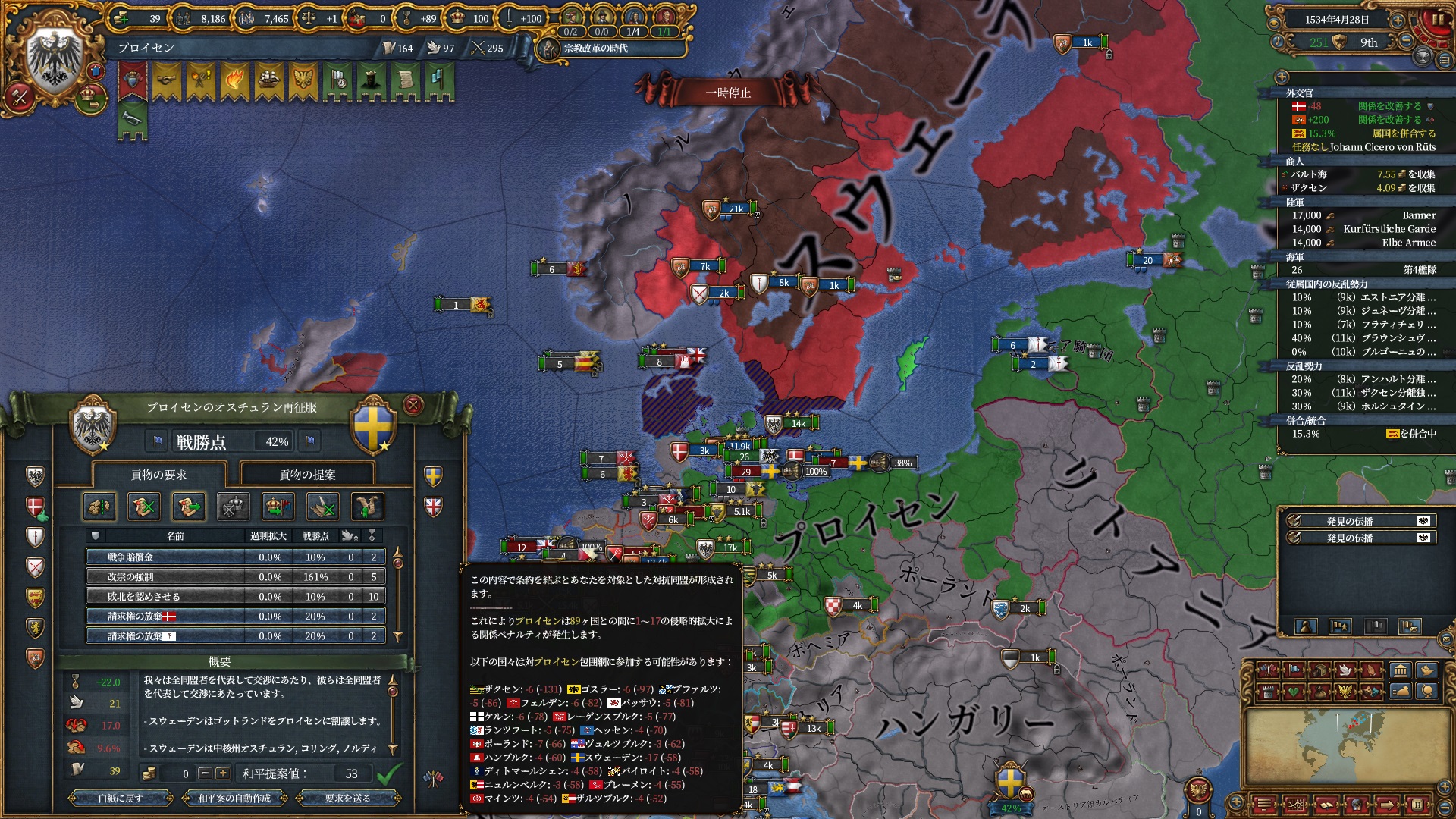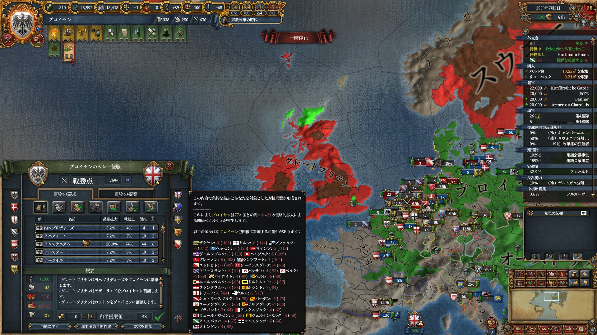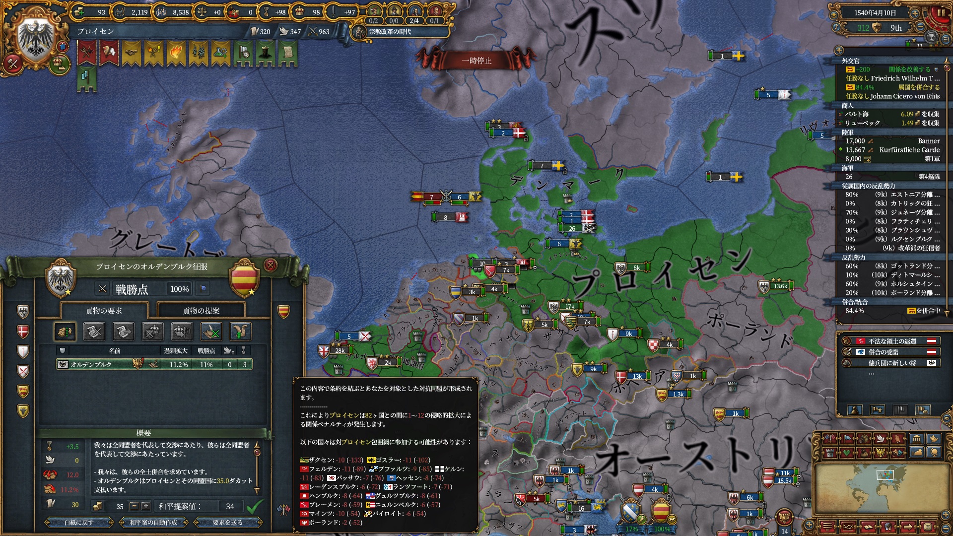 主戦国は仕方がないですが、共戦国は改宗の強制でプロテスタントに変えていき、後々カトリックではない状態で併合を狙います。