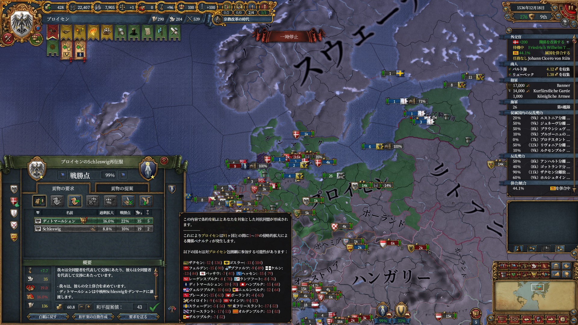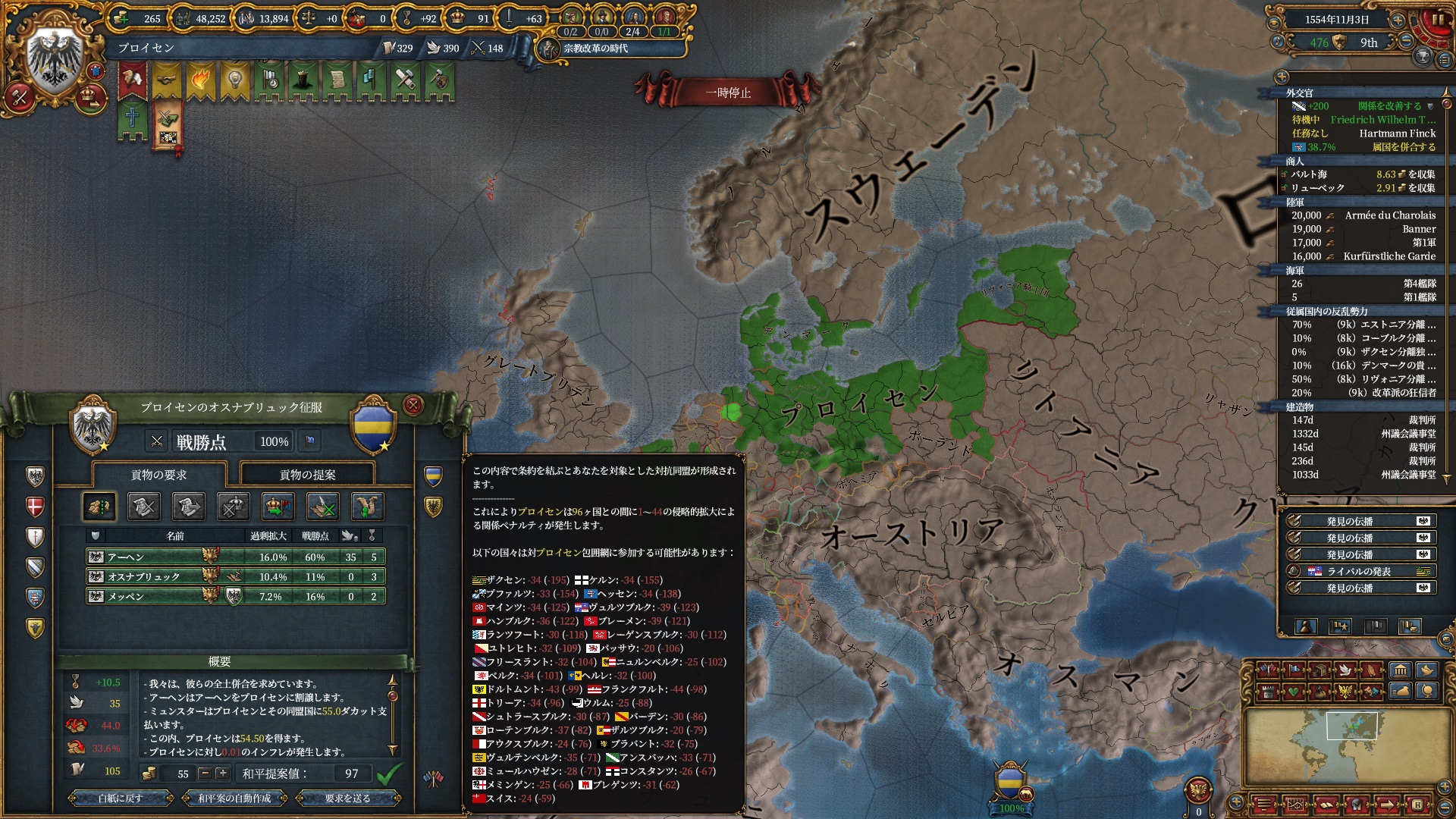 一応プロテスタントや改革派に宗教が分かれ始めたので、同宗教AE補正が薄まり始めています。