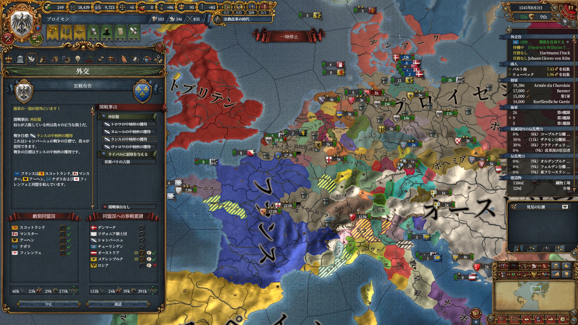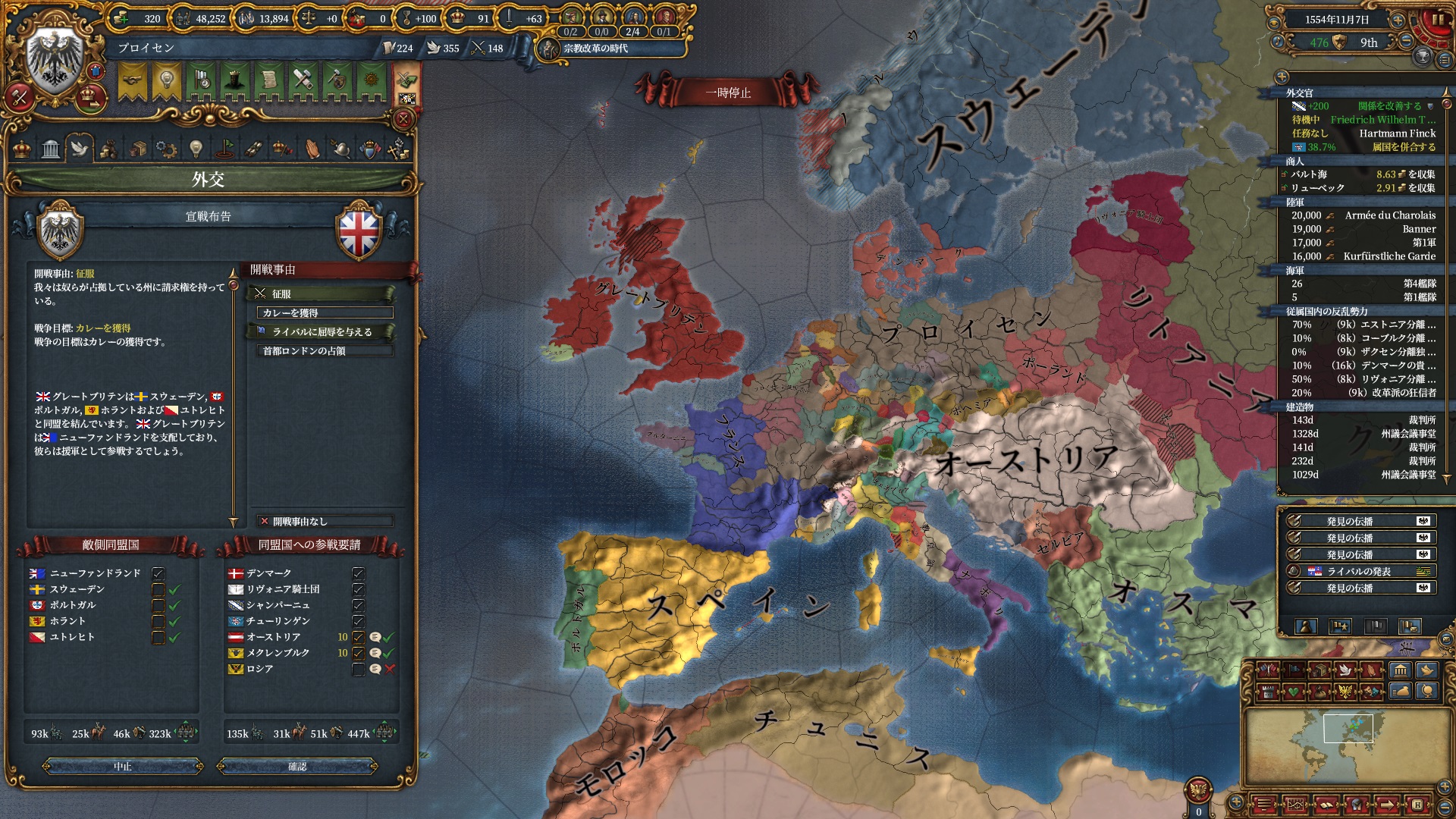 同盟国にポルトガル・スウェーデン・その他諸々がおり相手の戦力は強力ですが、こちらもオーストリアを連れていき数で上回ります。