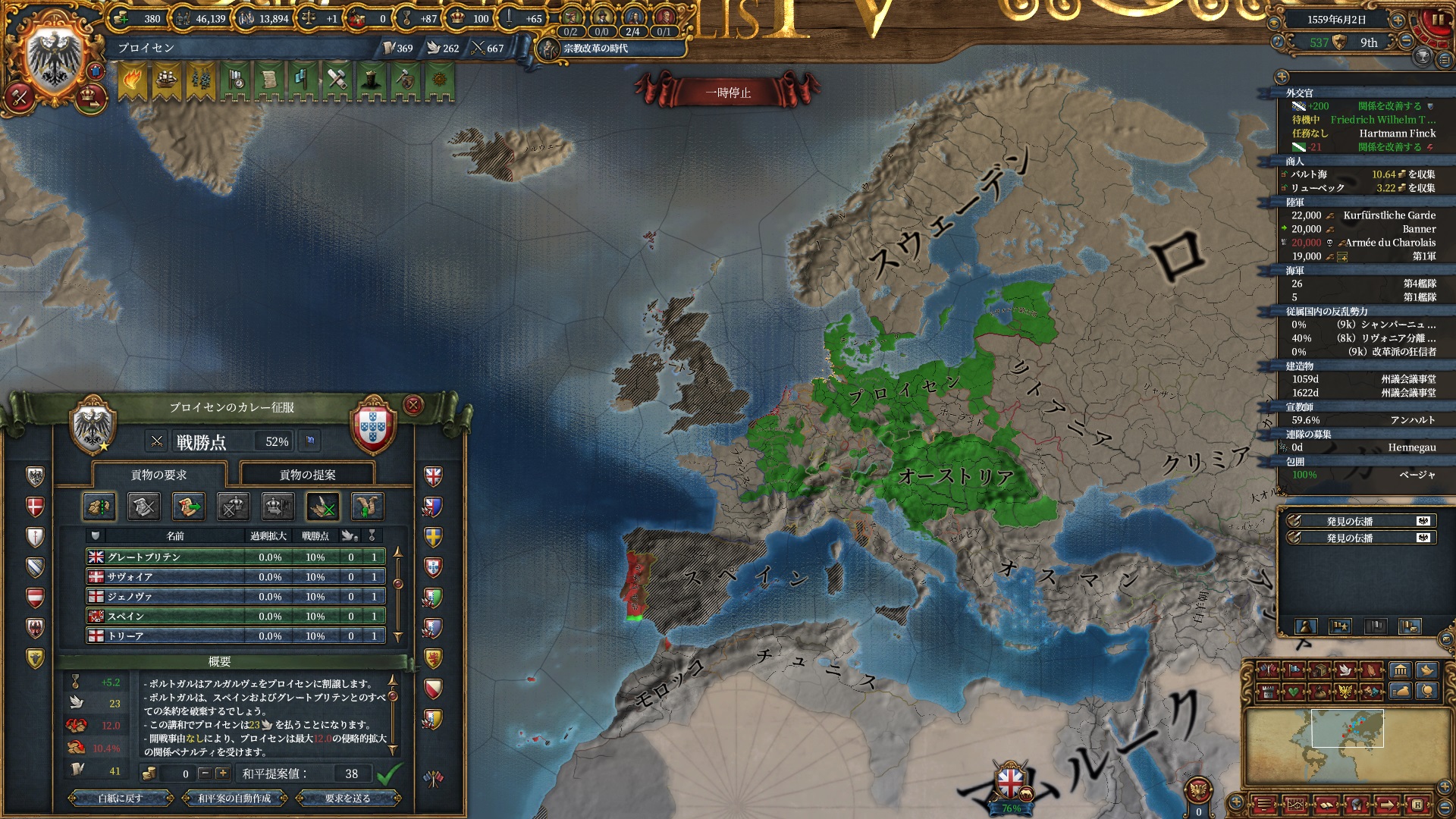 ポルトガルからはイベリアから1州奪い、以降新大陸コア化距離を稼ぎつつポルトガル・スペインどちらにも仕掛けられるようにしています。
