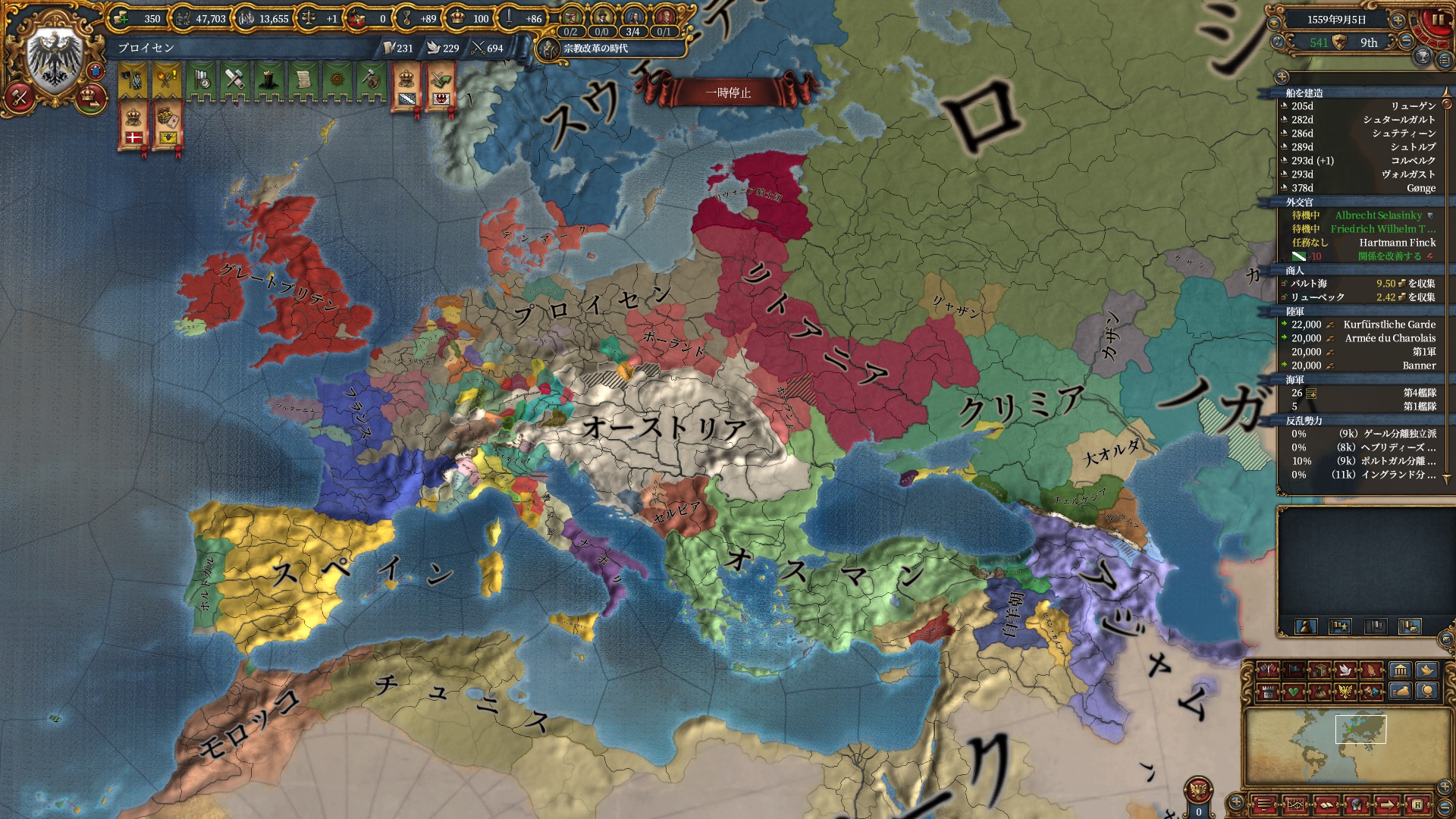 国難自体は反乱軍を沸かせて潰すだけなのと、今回のプレイ方針は欧州中心で動く戦略をとっており軍が付近にずっといるのもあって被害は少ないです。