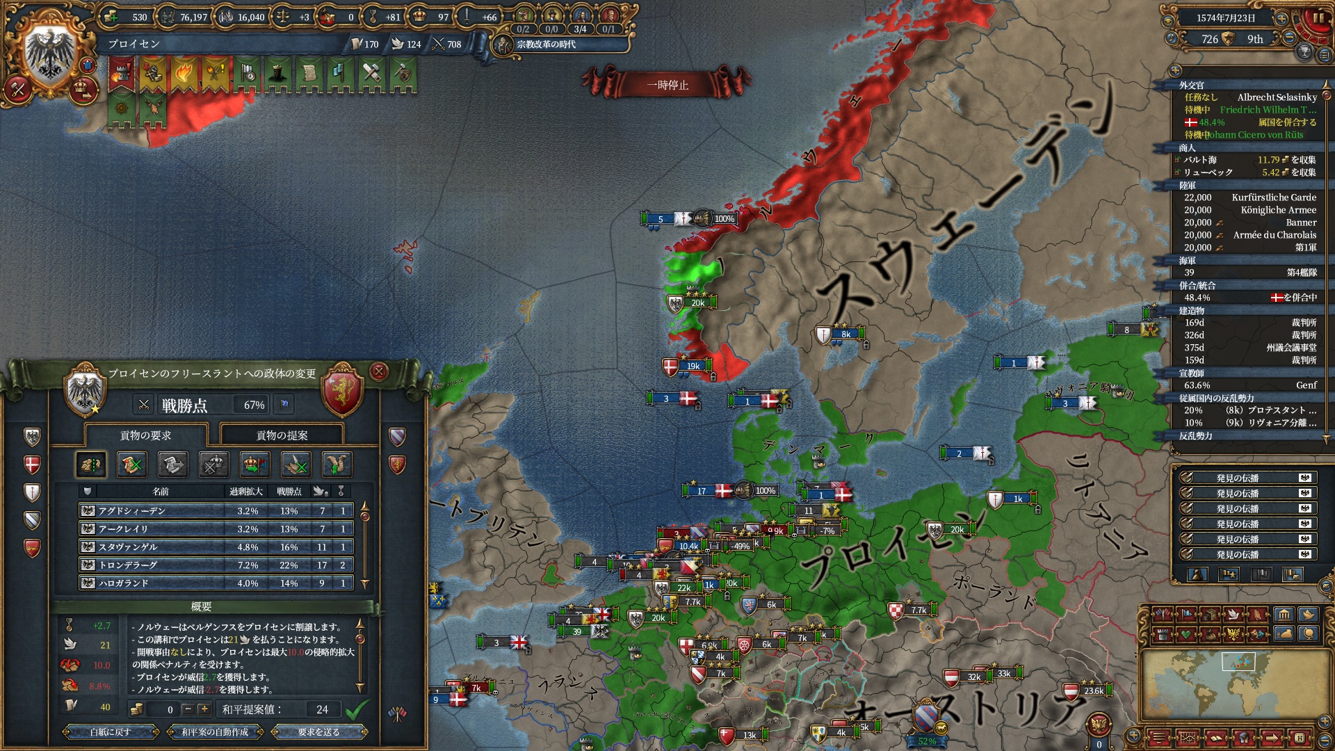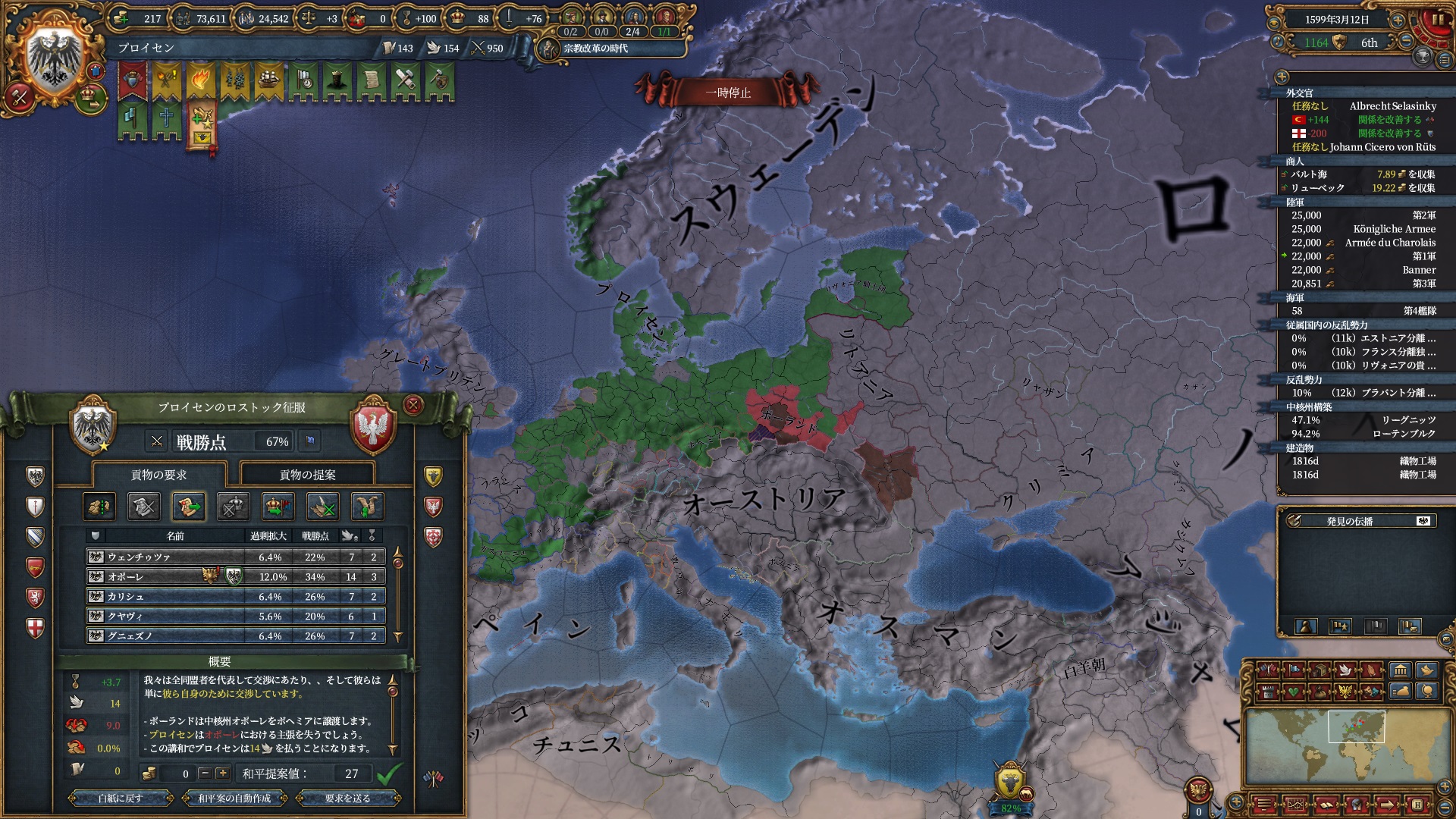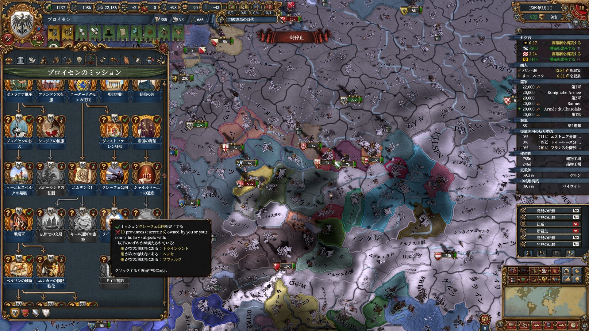 というわけでやる気は無かったのですが、運悪くプファルツがオーストリアの同君下位となってしまってプロイセンミッションで特に大事な統治効率ルートが進まなくなっています。