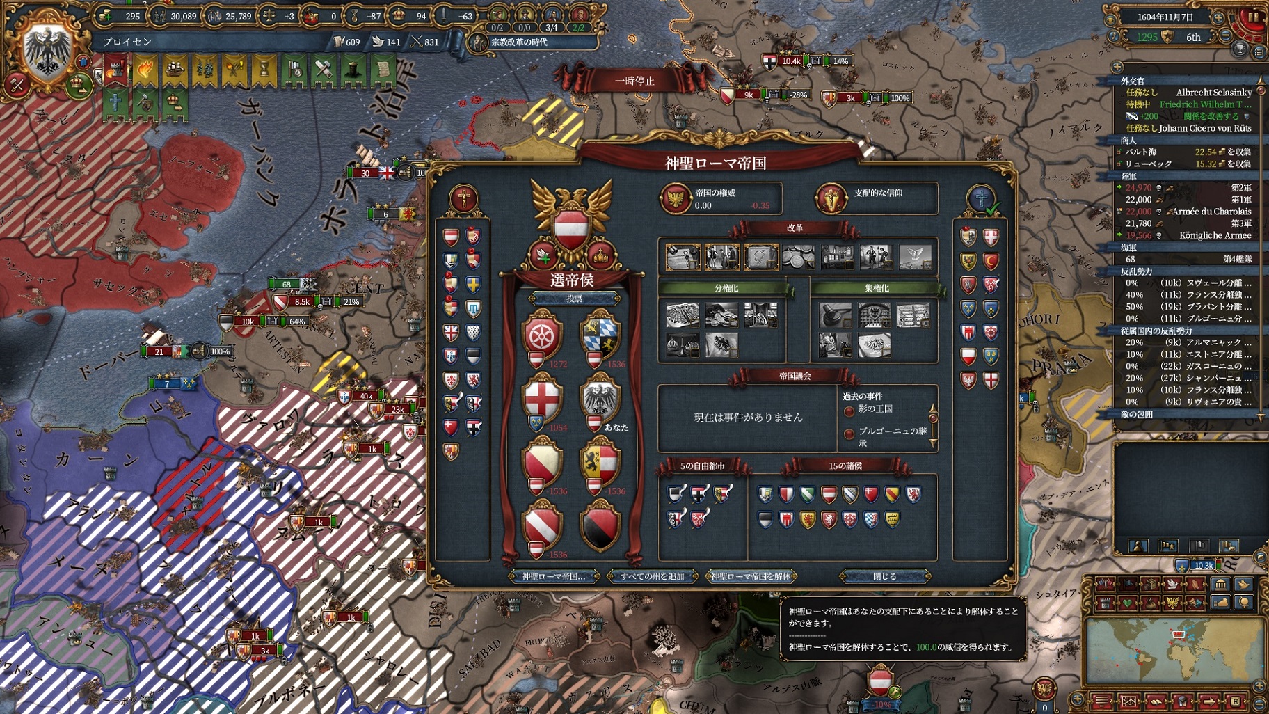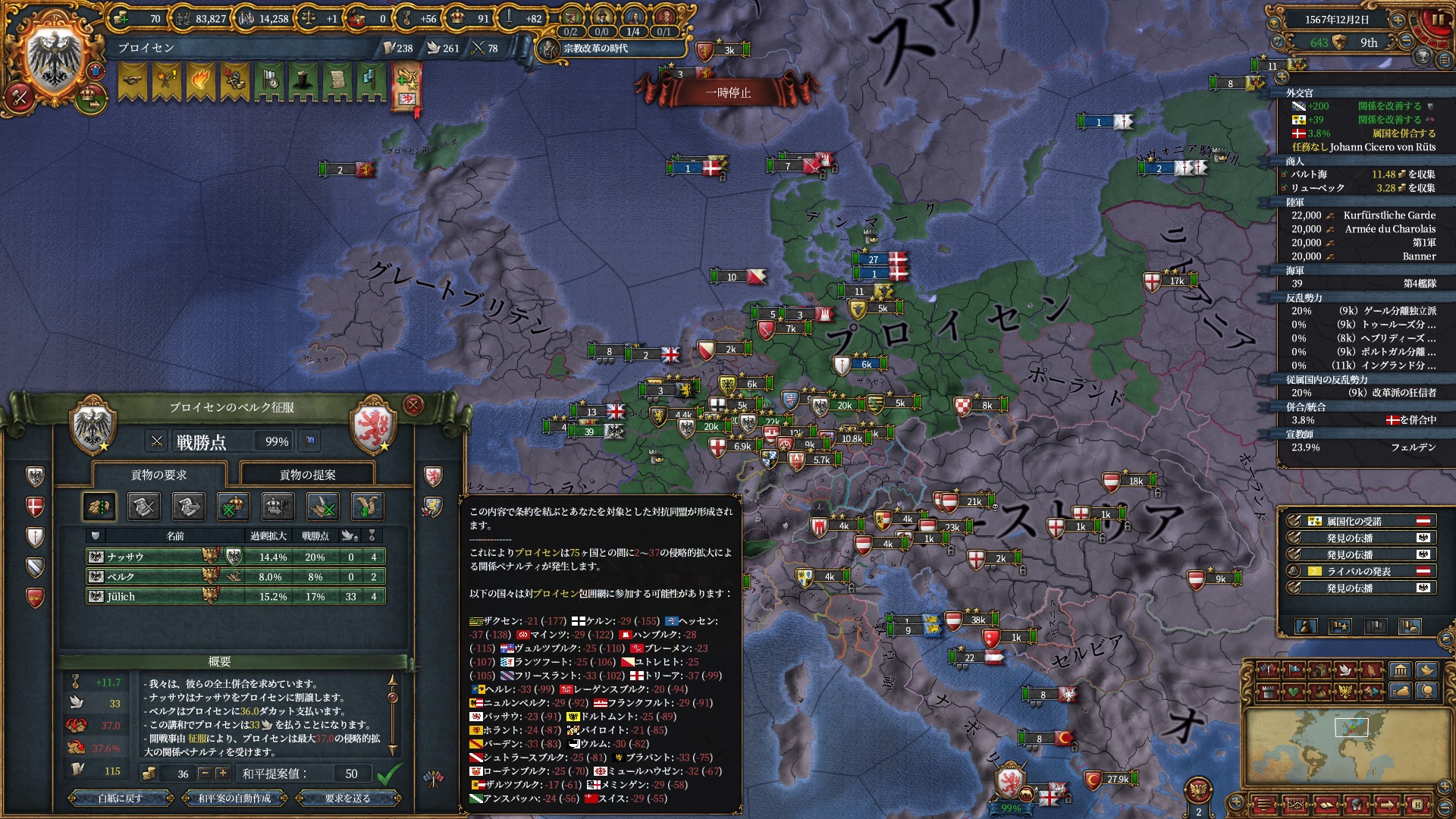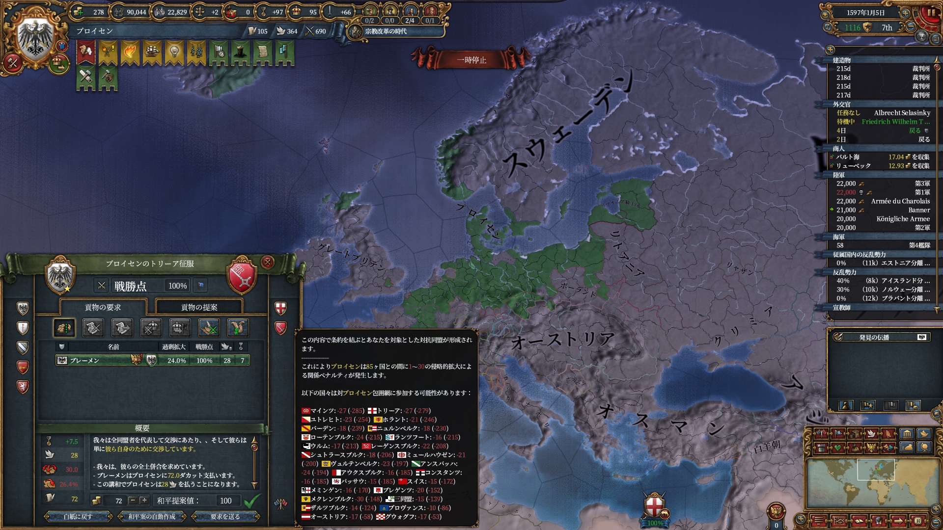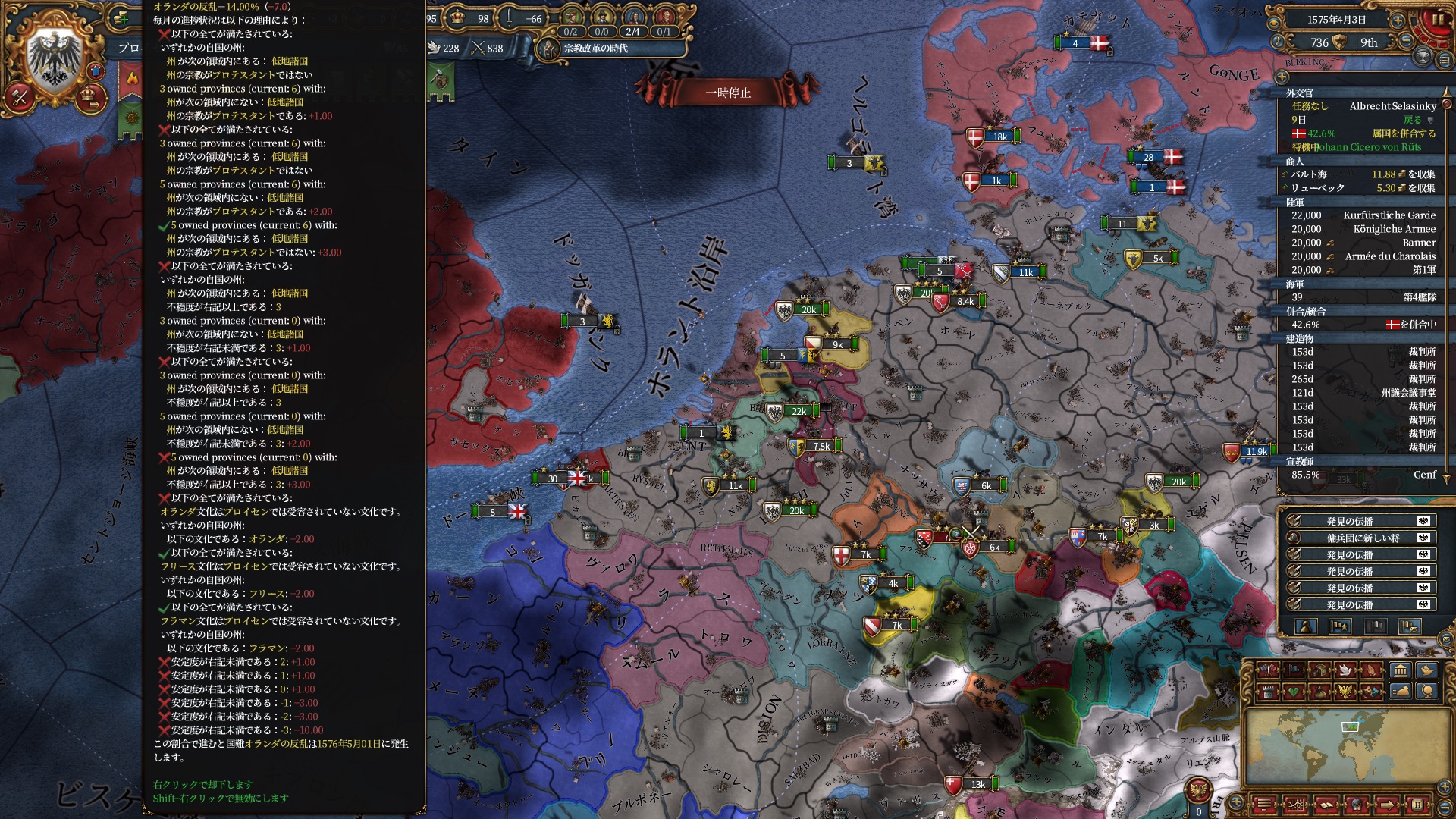 宗教改革の時代も後半、既にdev1000を超えており帝国ランクにはいつでもなれるのでプロイセン君主制で低くなっている統治キャパの為にもHRE離脱の目途を付ける頃合。