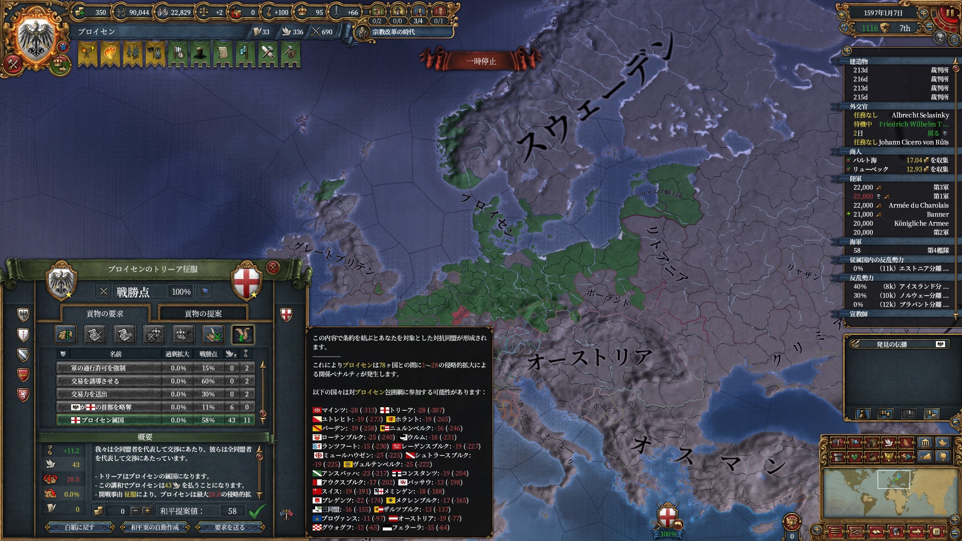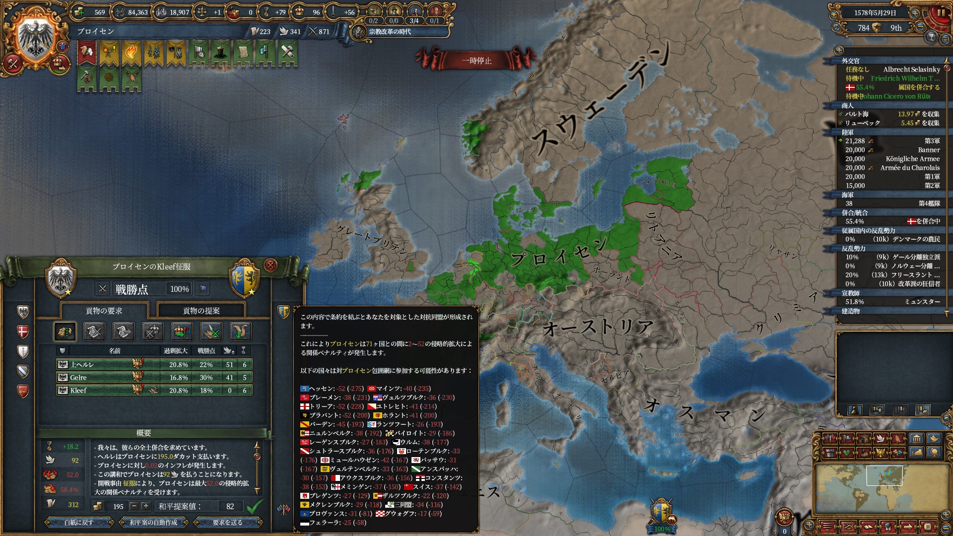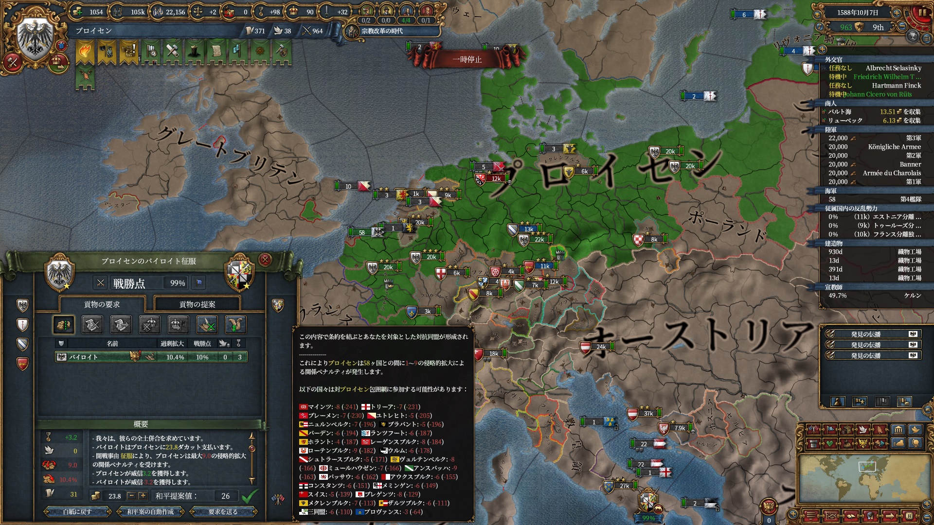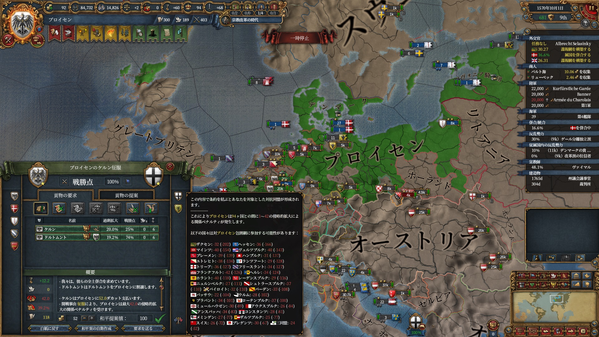 宗教改革の時代も後半、既にdev1000を超えており帝国ランクにはいつでもなれるのでプロイセン君主制で低くなっている統治キャパの為にもHRE離脱の目途を付ける頃合。