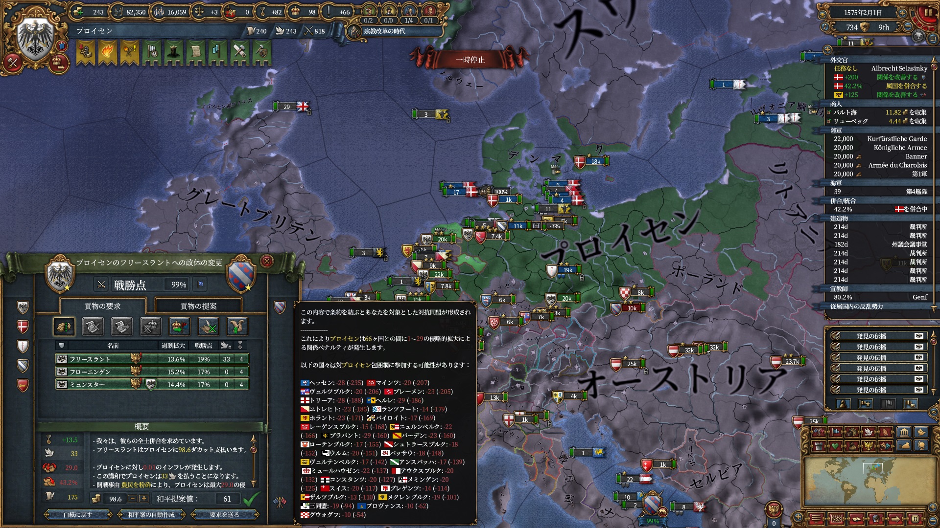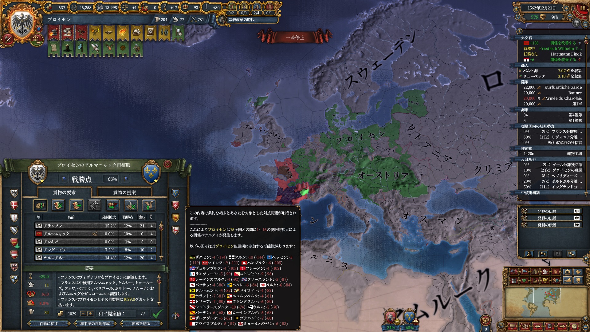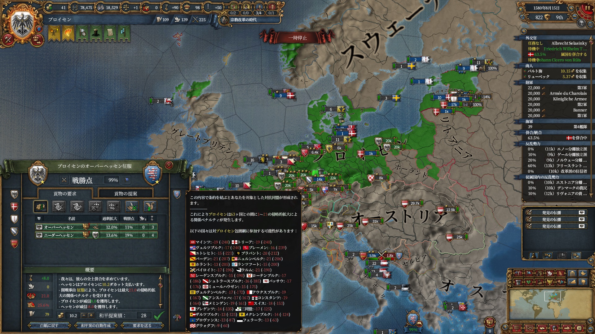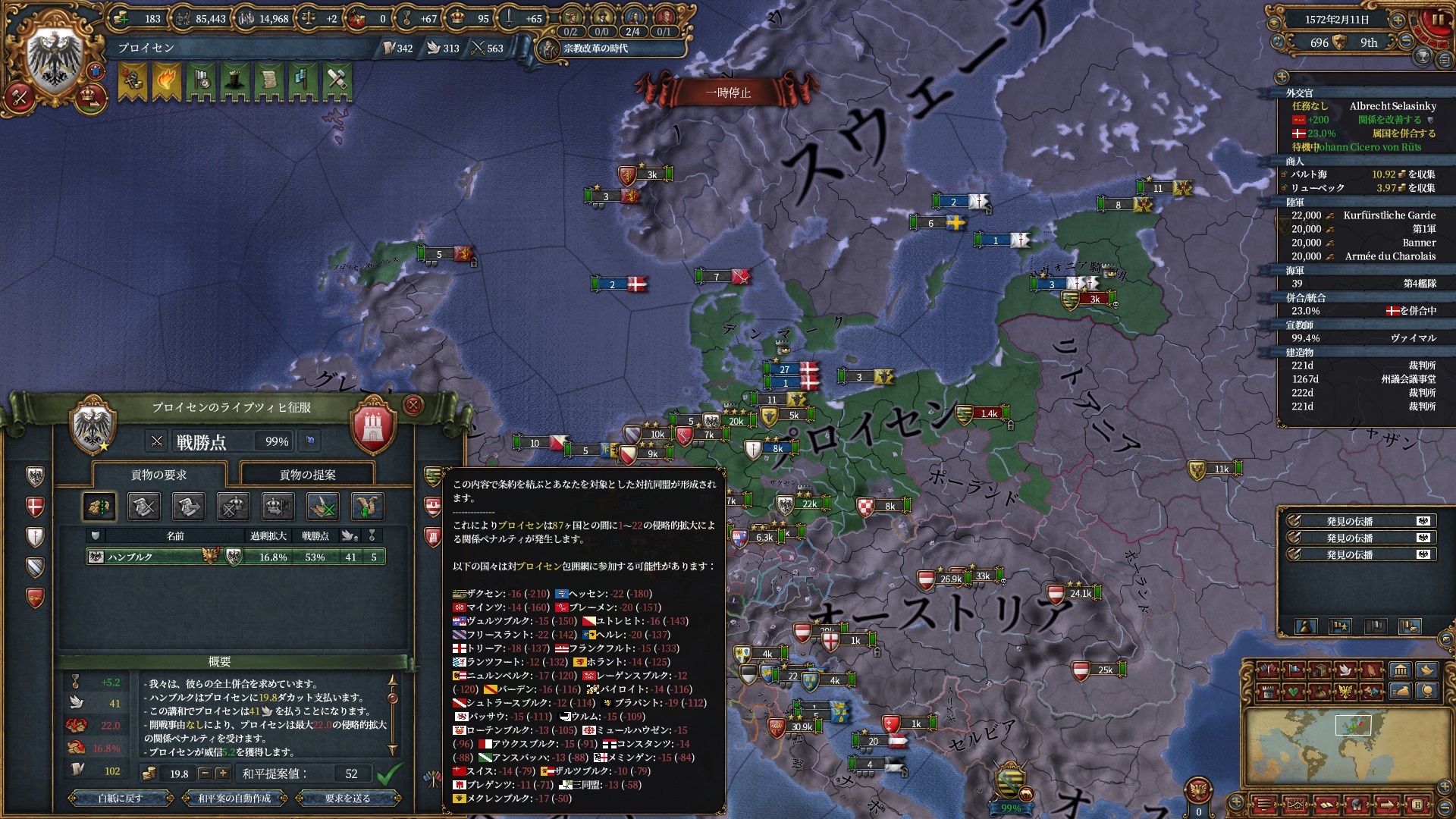 宗教改革の時代も後半、既にdev1000を超えており帝国ランクにはいつでもなれるのでプロイセン君主制で低くなっている統治キャパの為にもHRE離脱の目途を付ける頃合。