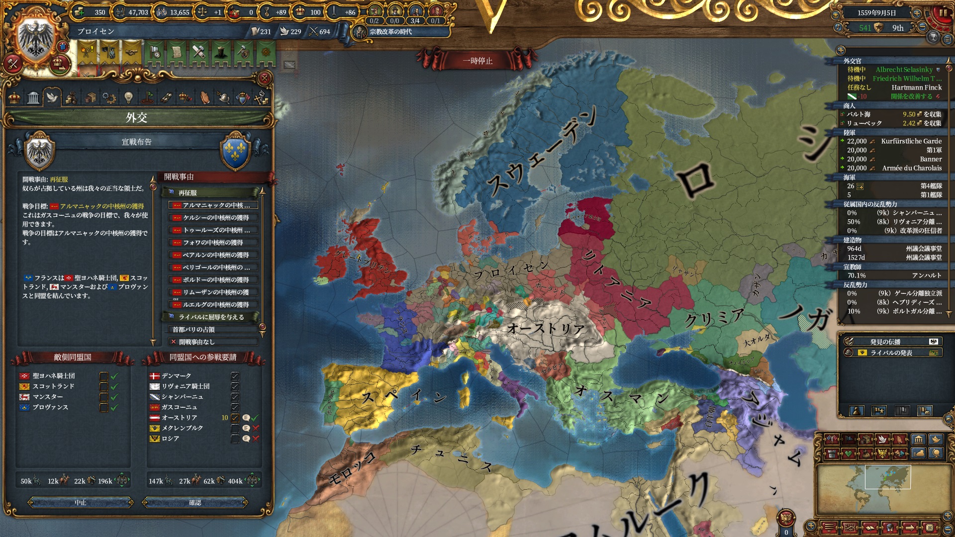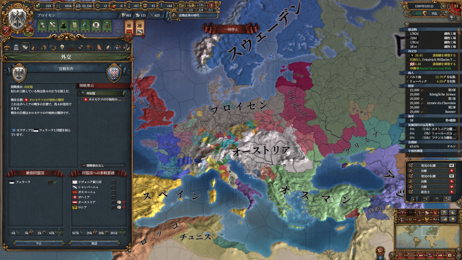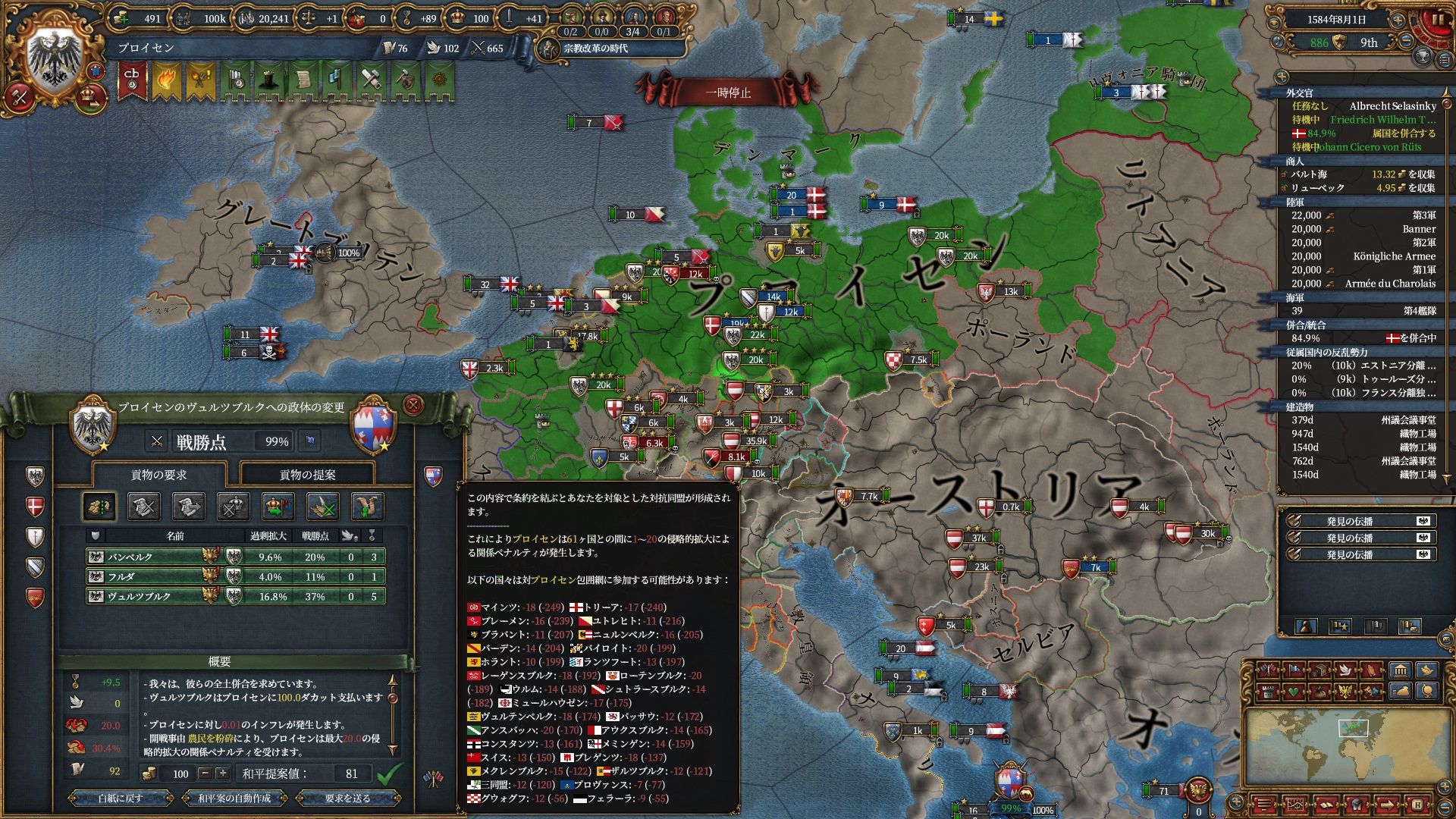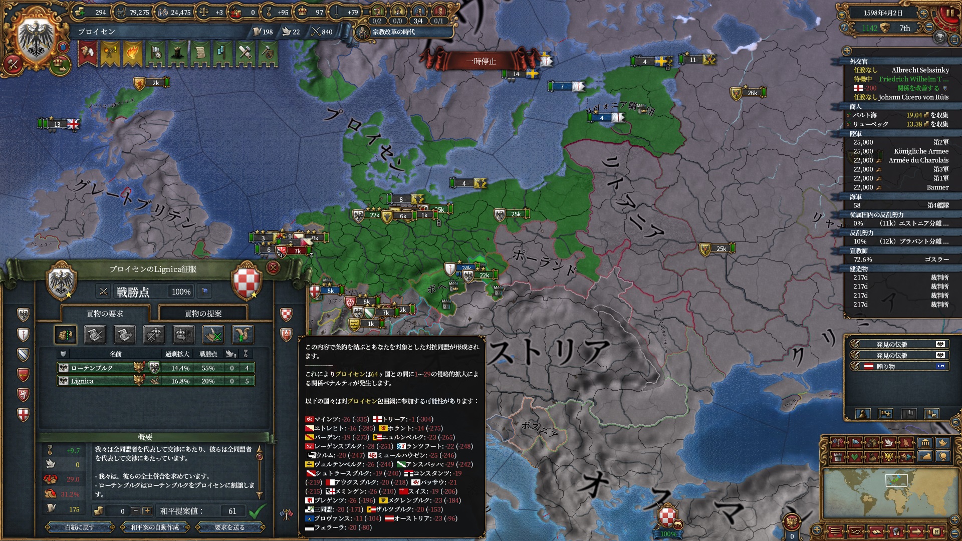宗教改革の時代も後半、既にdev1000を超えており帝国ランクにはいつでもなれるのでプロイセン君主制で低くなっている統治キャパの為にもHRE離脱の目途を付ける頃合。