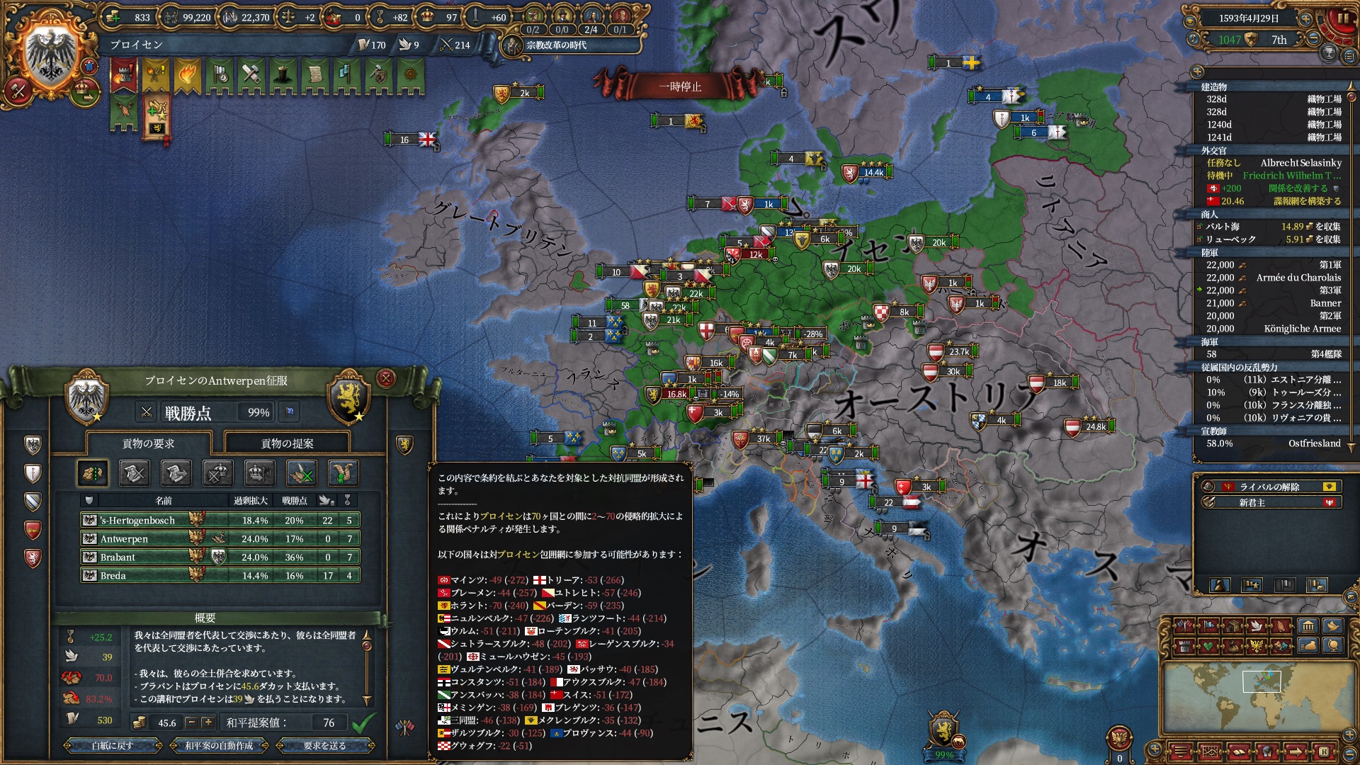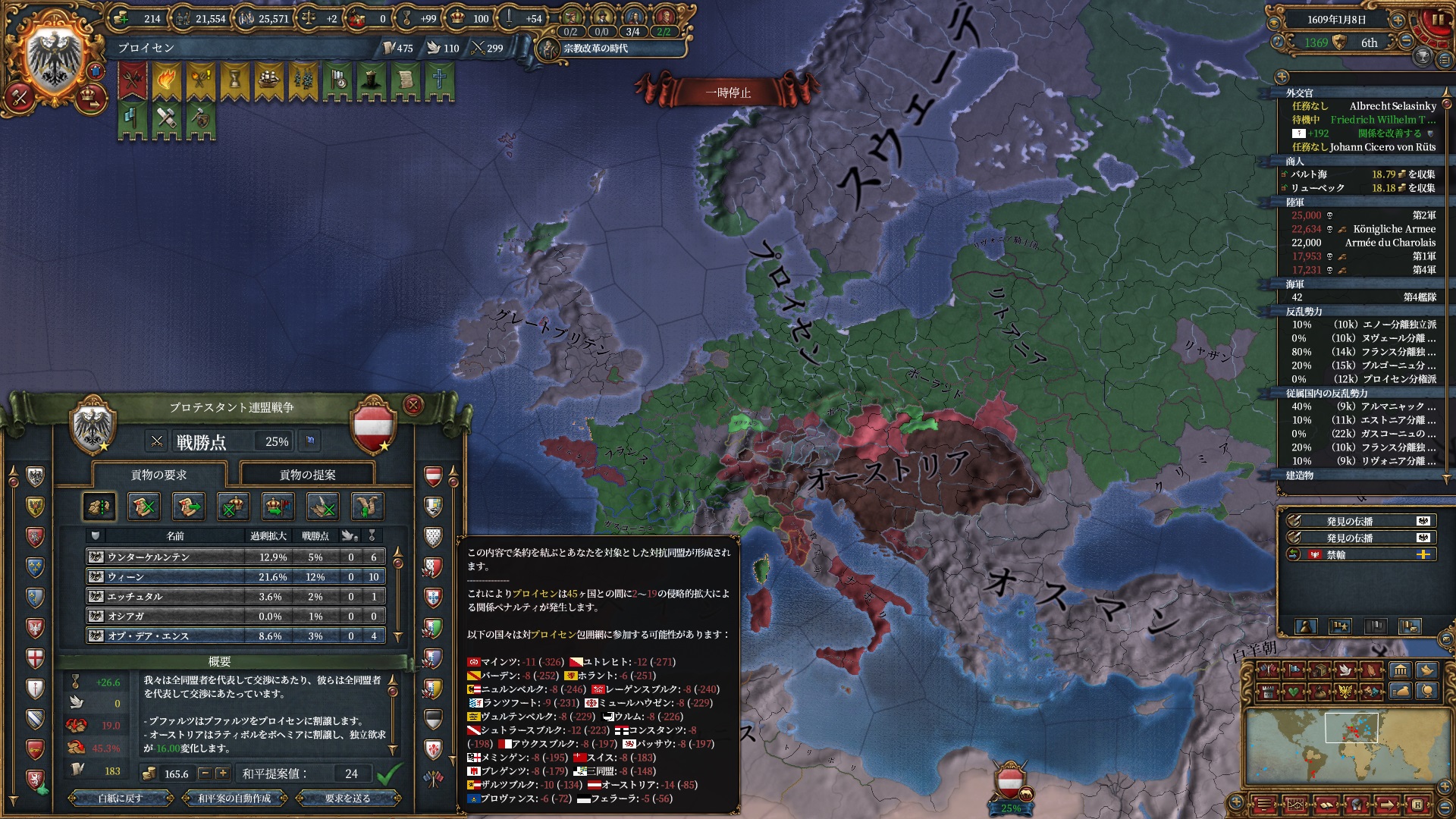 30年戦争中は個別和平も結構苦労しますが頑張って1国ずつ減らしていきます。