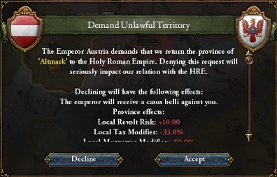 当然無視することになるが、獲得地に反乱リスク上昇などのペナルティが10年つく。
