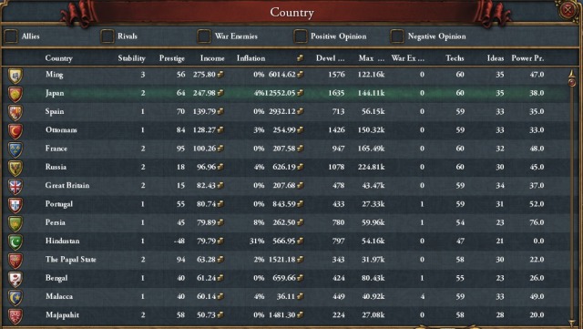 日本は足利義晴の長期に渡る治世において大きく領土を拡大し国力を大幅に向上させた。