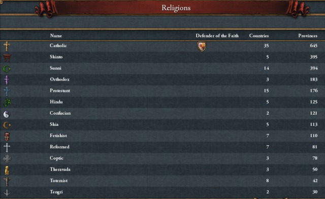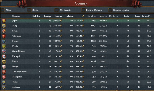 やはりオスマンの勢力が強大です。また、南蛮人共も新大陸に広大な植民地を有しており侮れません。