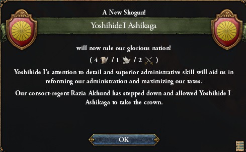 第16代将軍足利義春死去…嫡子義栄の元服を待つ形で御台所ラジア・アフンド(3.3.1)が政務を代行した。