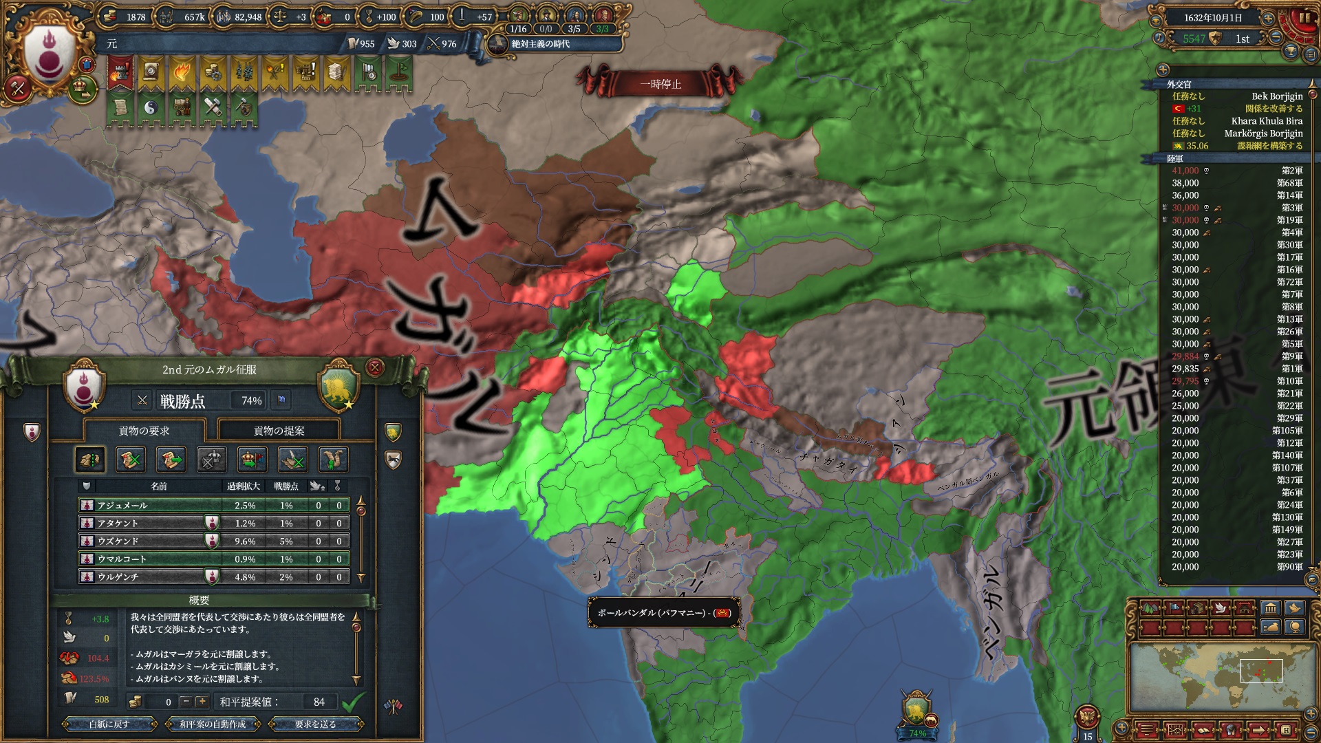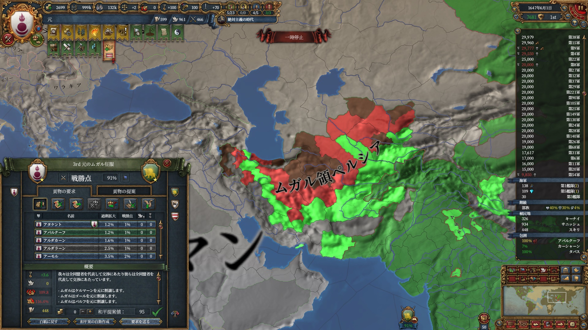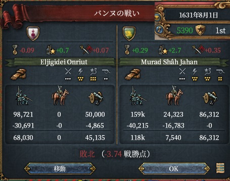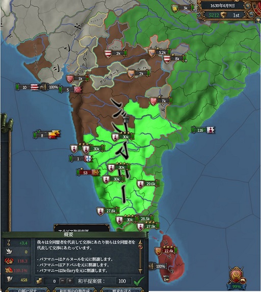 3度目のムガル戦、開戦から16か月で95点和平です。今度は先ほどみたいなクソのようなミスせずきれいに戦えました