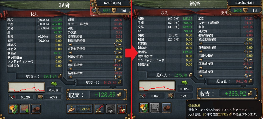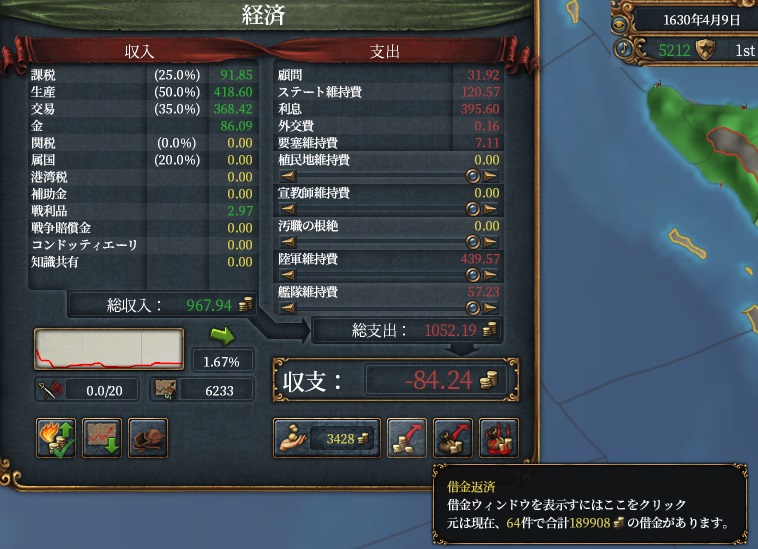 結果黒字になりましたけど、借金が8年で1.5倍になりました。うん、内政ポチポチ頑張りました