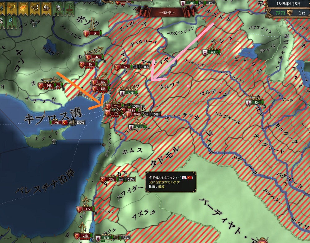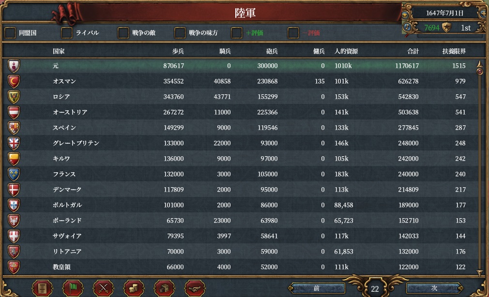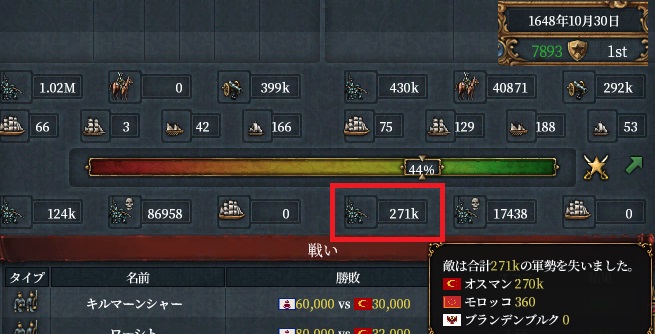 規律を140まで上げてその期間のうちに2位~4位に致命傷を与えることが狙いだったのですが、、まだイベントは発動しておらず結果オスマンには規律130で立ち向かいます
