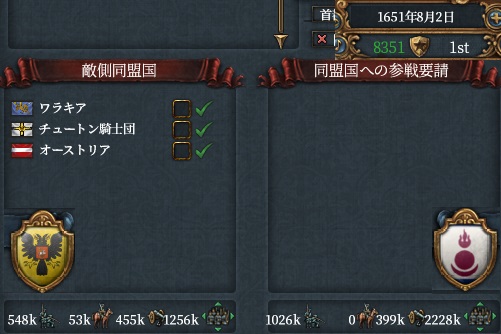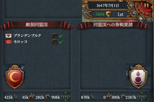 3位と4位の同盟を同時に相手取ります。ゲーム内最大の強敵ですが規律140の時期であることから開戦を決意しました