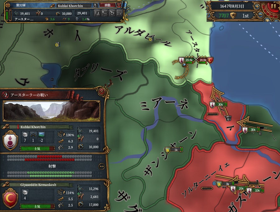国境沿いにいたオスマンと交戦。軍質では優位を取っているものの、さすがに山岳攻撃側だとキルレは美味しくありません