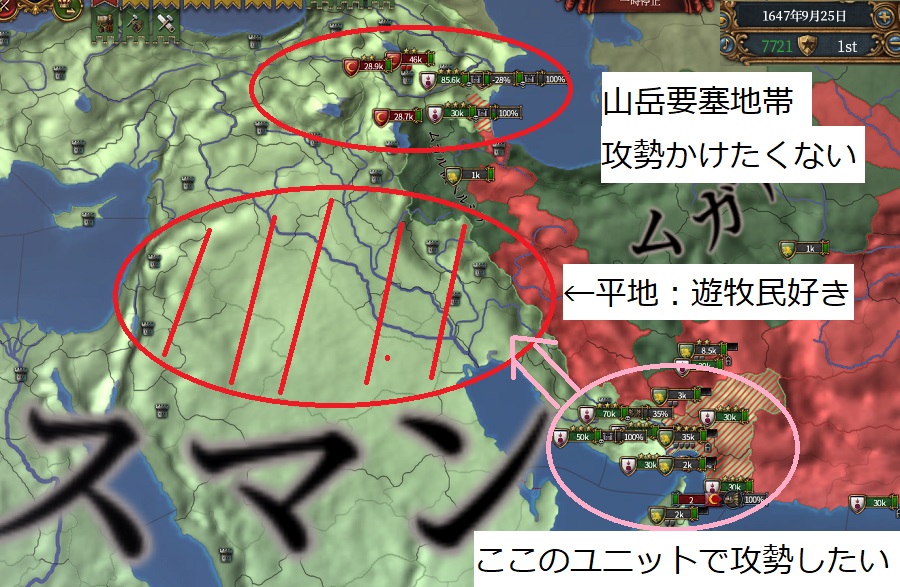 ここで扉にも使っていた画像。オスマンが平地におりてきました、こちらも山岳から降りて決戦をかけて戦勝点稼ぎます