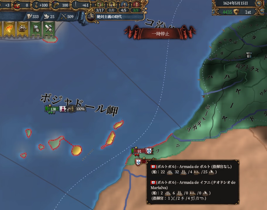 予備プランは軍事通行権貰ってインドから歩いてイベリアに行くというくっそ面倒なプラン。取れるのアルハンブラのみなので、聖ヨハネ騎士団の同盟切って再度殴るという時間もかかります