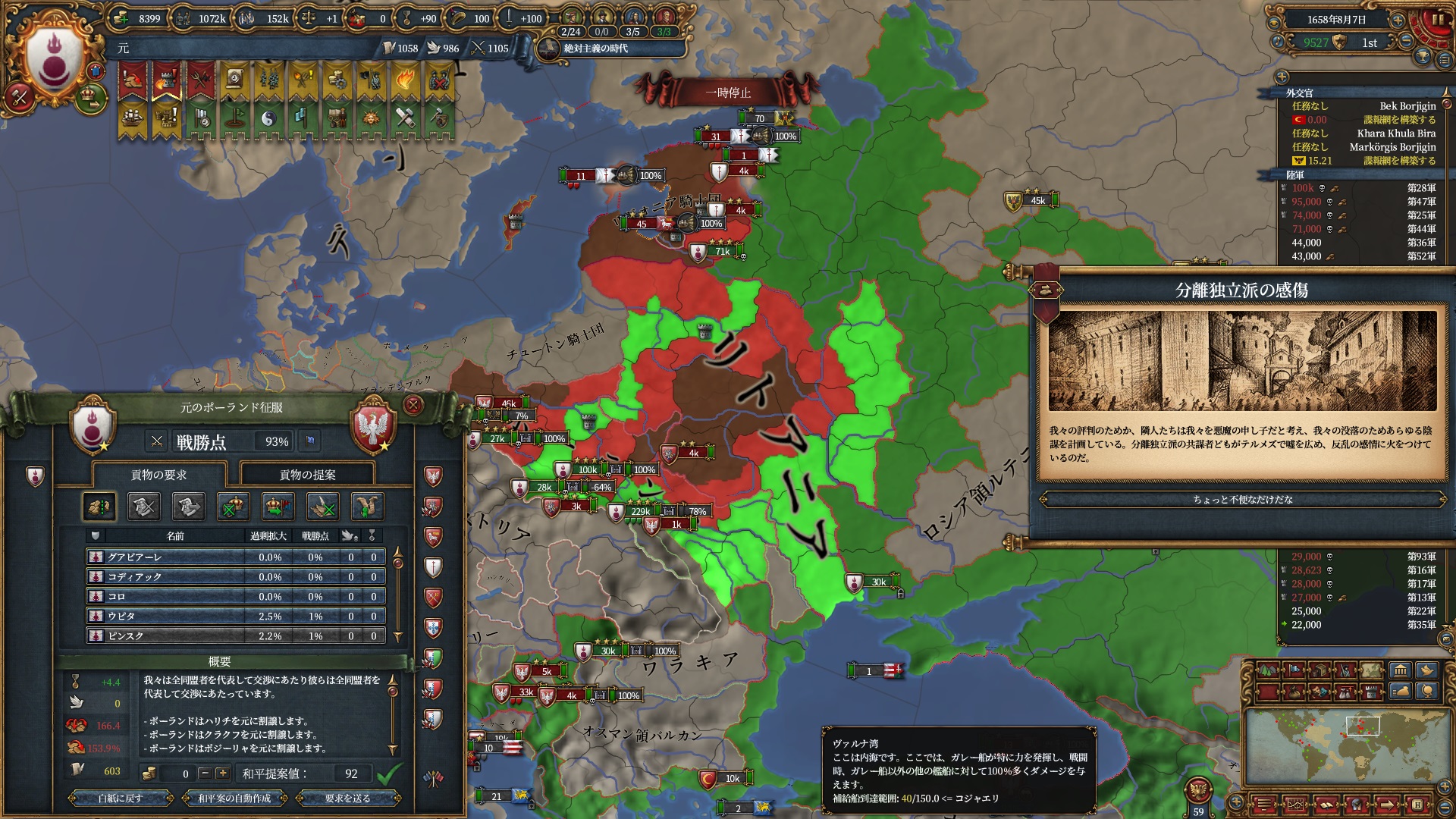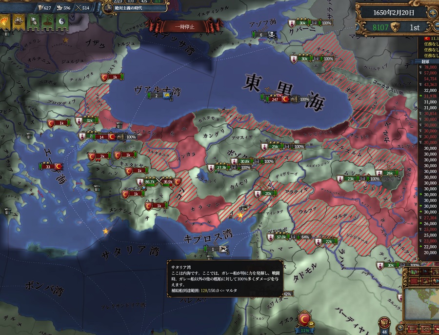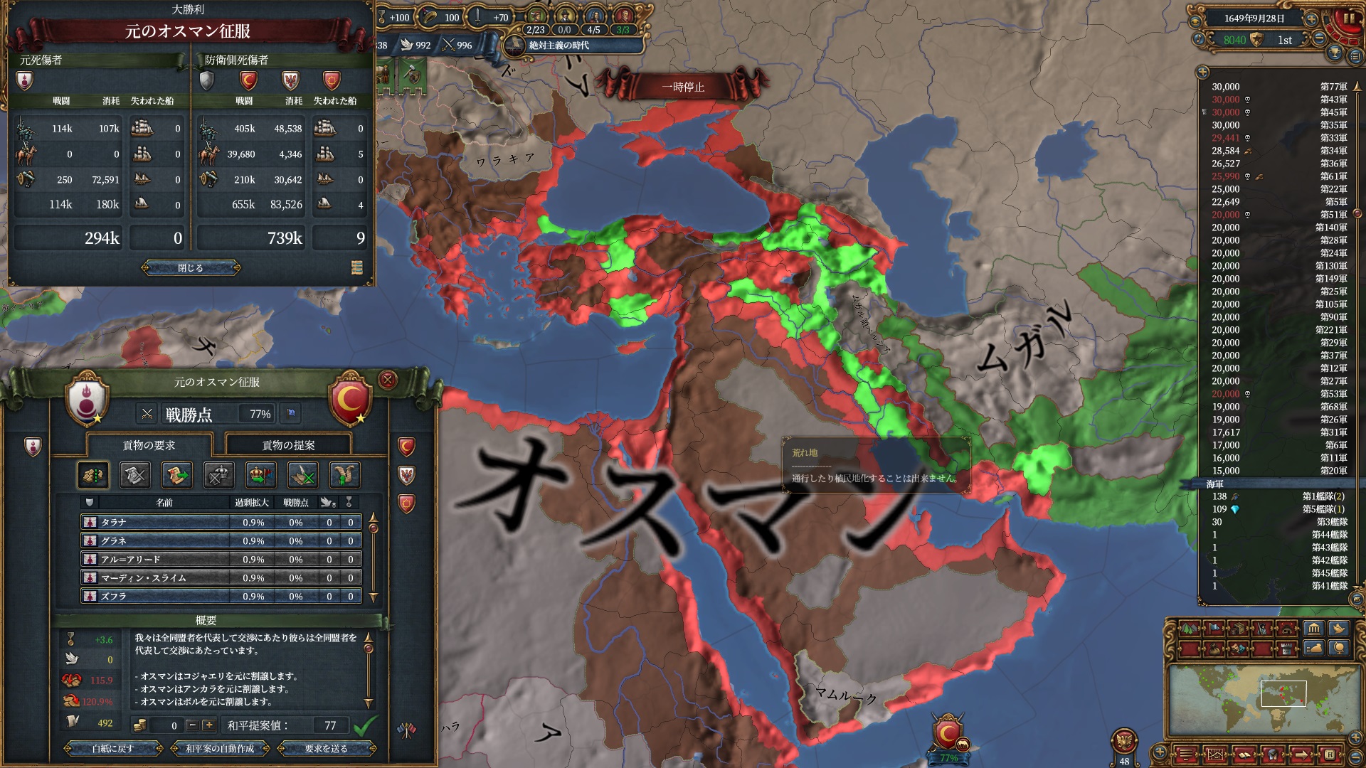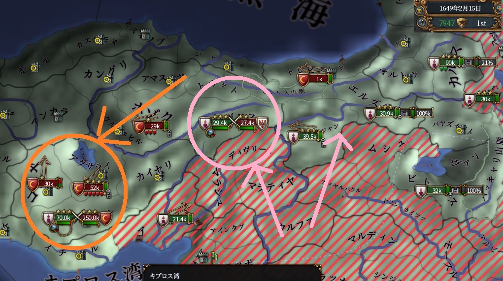 77点和平です、塗り絵よりも野戦由来の戦勝点が多いですね。主に要塞地帯を中心に、あとコンスタンティノープルを取りヨーロッパ側への通行を確保しました
