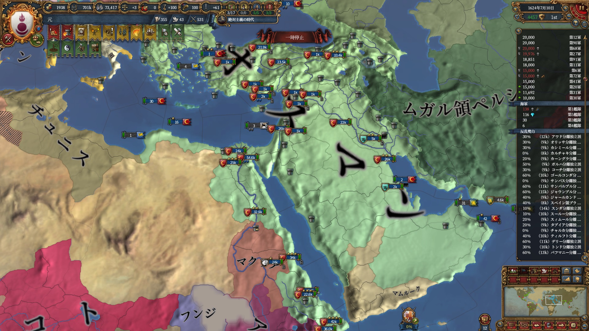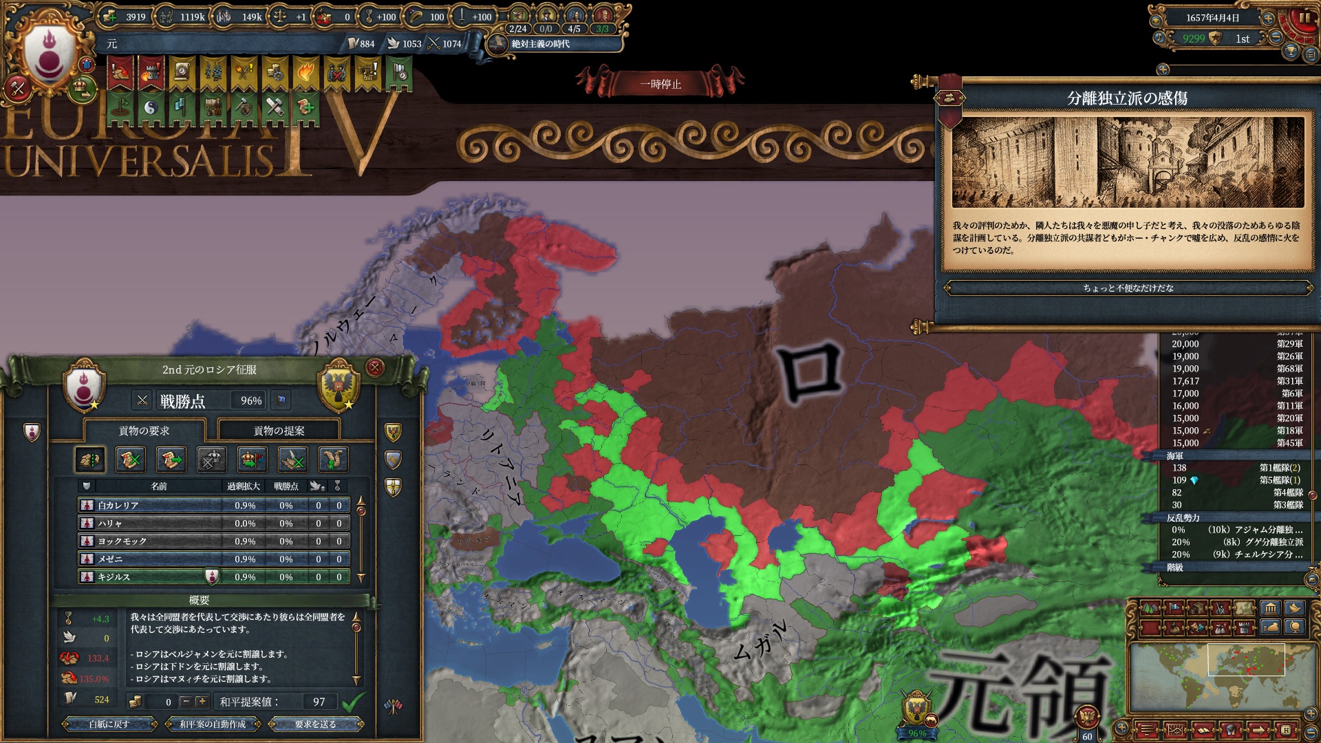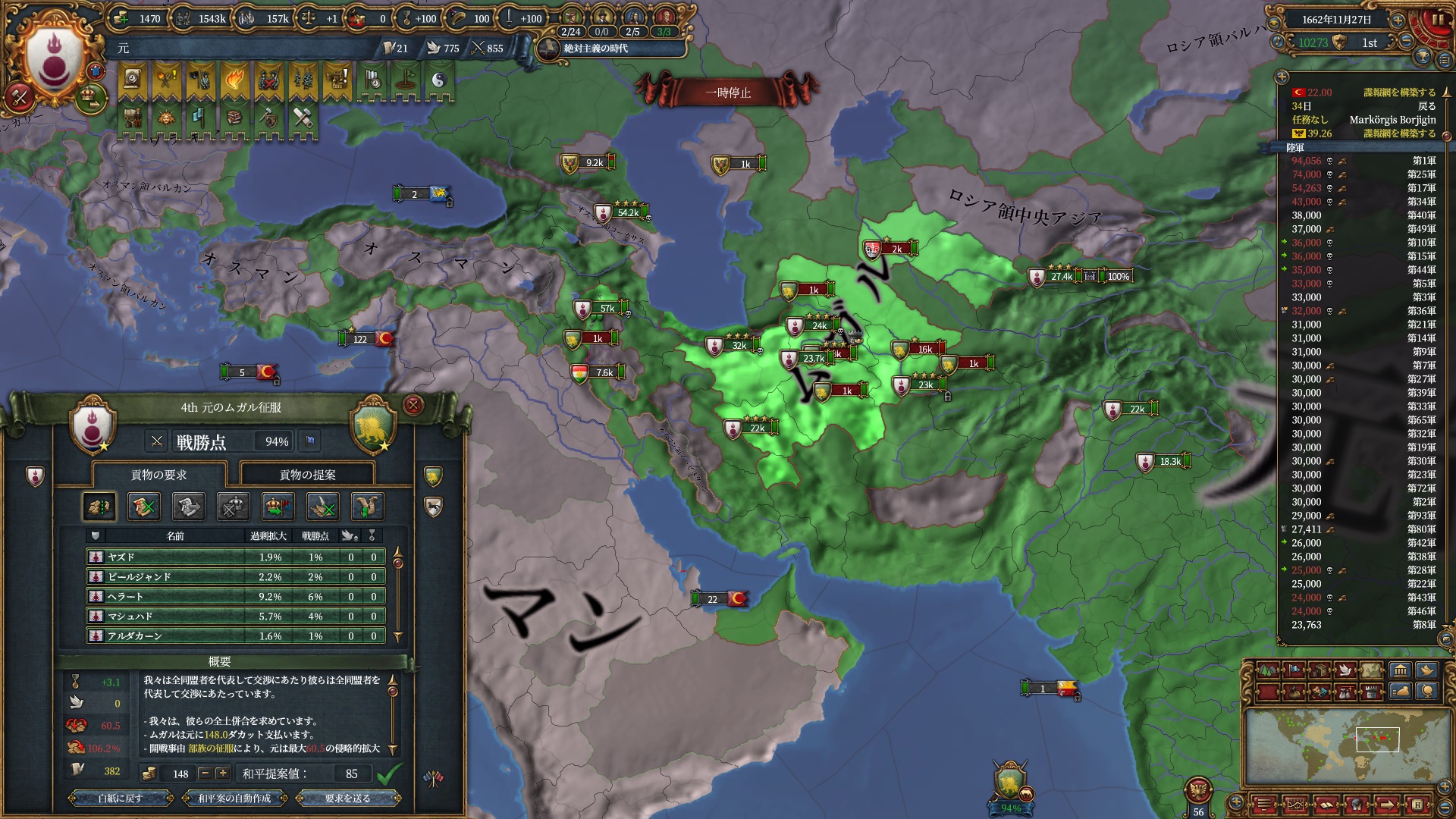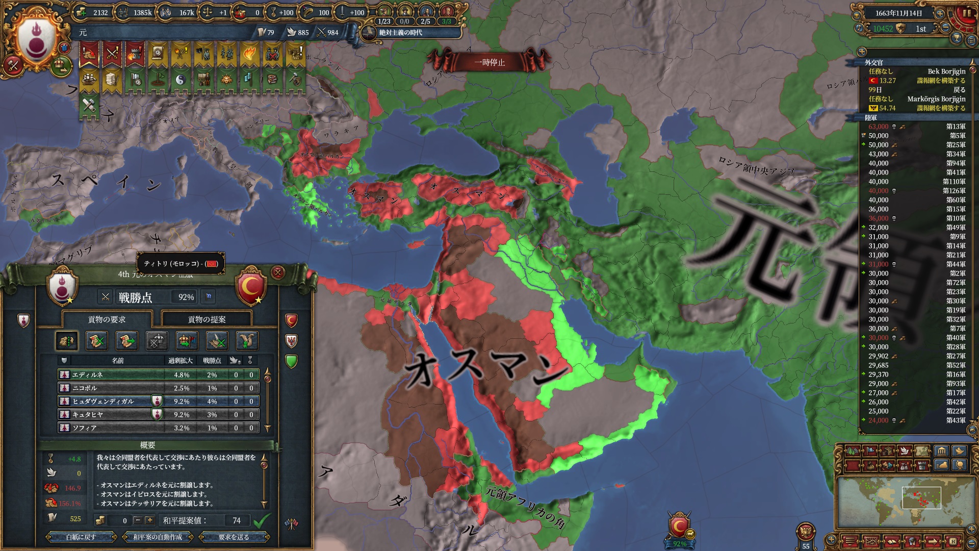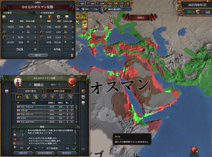 ロシア戦の間に過去2回のオスマンのコア化終わったので停戦破棄して3回戦目に突入しました