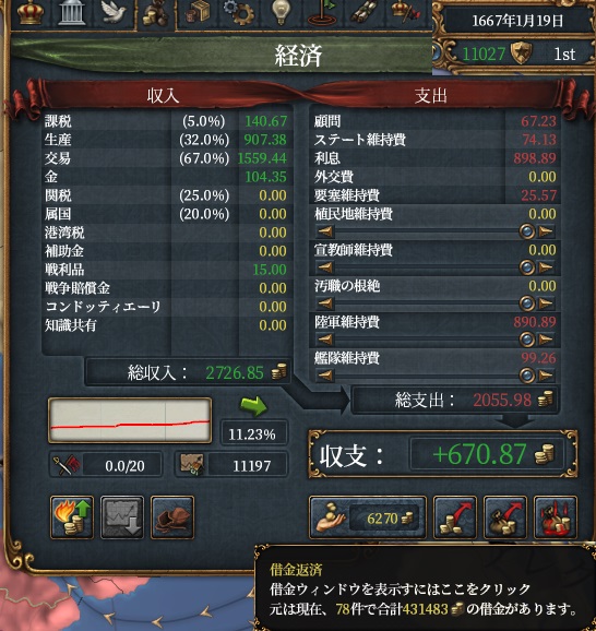 兵数とFL:1071/1207,最大人的1157k,人的回復12k/月,借金277000。支配したインドの地の交易会社に投資を、一部はステートにして建築物を建てていました