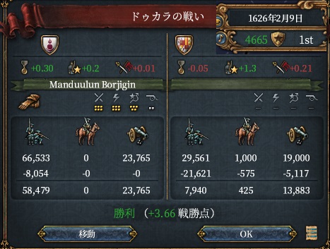 あと戦勝点は44。うーん、野戦でもう少し稼ぎたいです