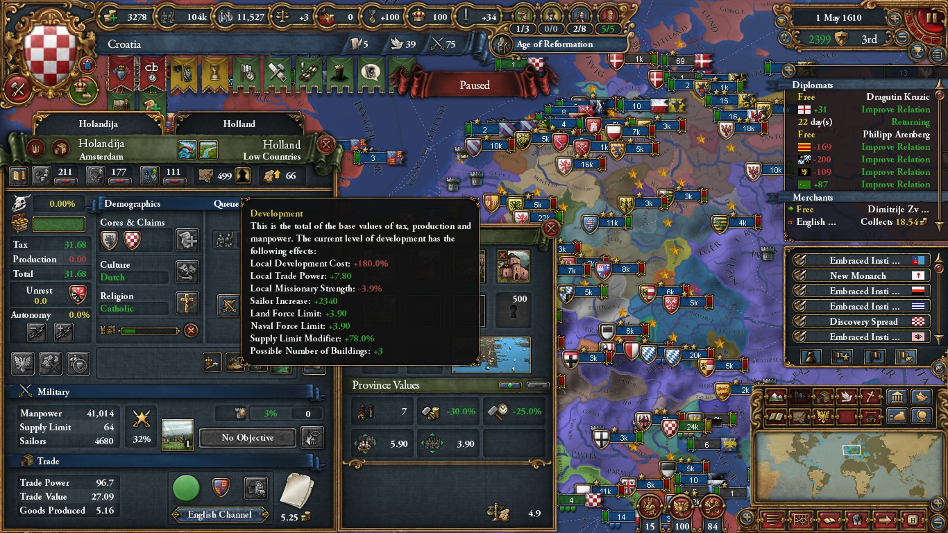 理由としては、CoTがある、交易品生産量補正がある、海に面しているため海軍の面で優位、紙の価値が高い、そして何よりイギリス海峡ノードに属していることが挙げられる。
