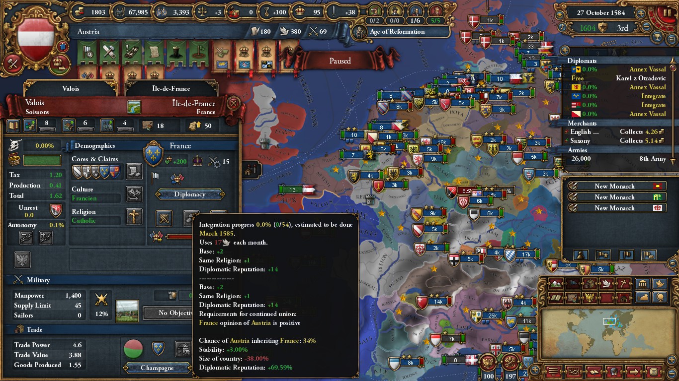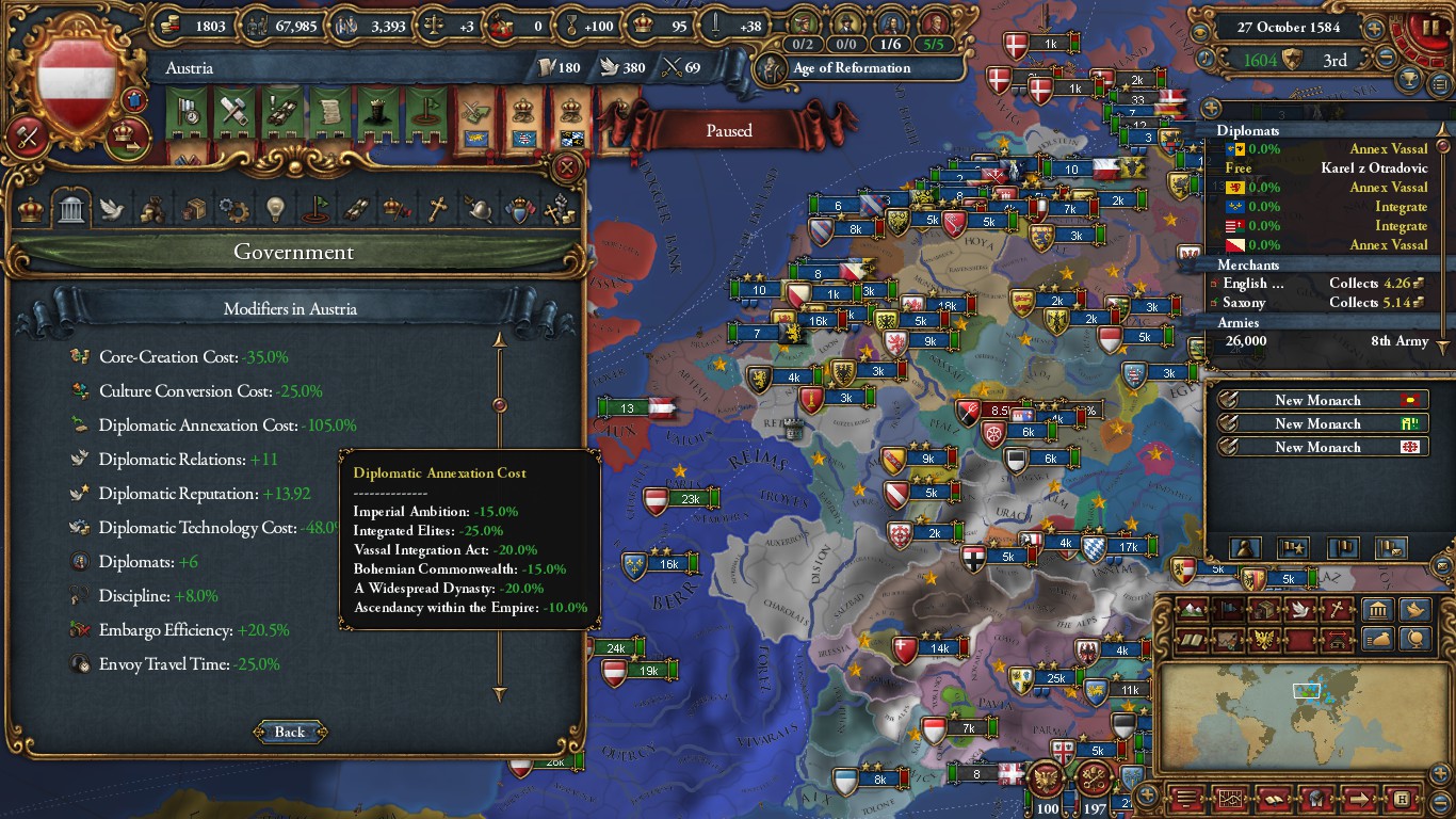 またオーストリアの有限外交コスト減の報酬に関しては、国家変態を繰り返す作業で多くの属国を併合しなければならなかったため、もともとのボヘミアの報酬やアイデア・ポリシーのスタックで-105%まで積み上げ最小の外交点の消費で済んだのでとてもありがたかった。