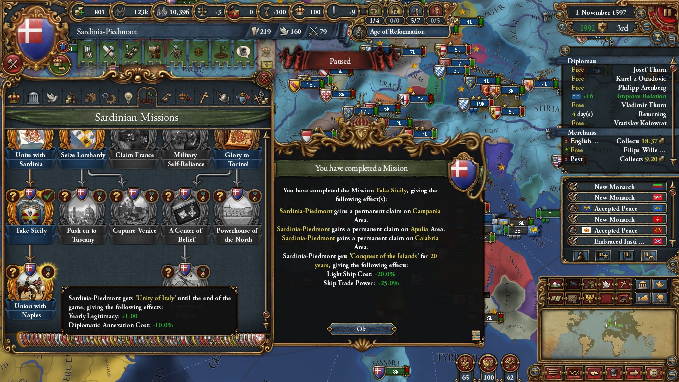 HRE州が250超えたため、ミッションから恒久の外交君主+1と分離主義-5年得られた。