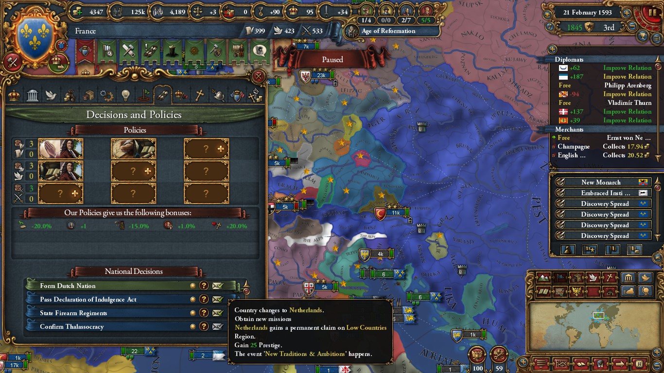 ミッションを達成して、外交併合コストが-105%*1になったため、フランス、ハンガリー、低地諸国