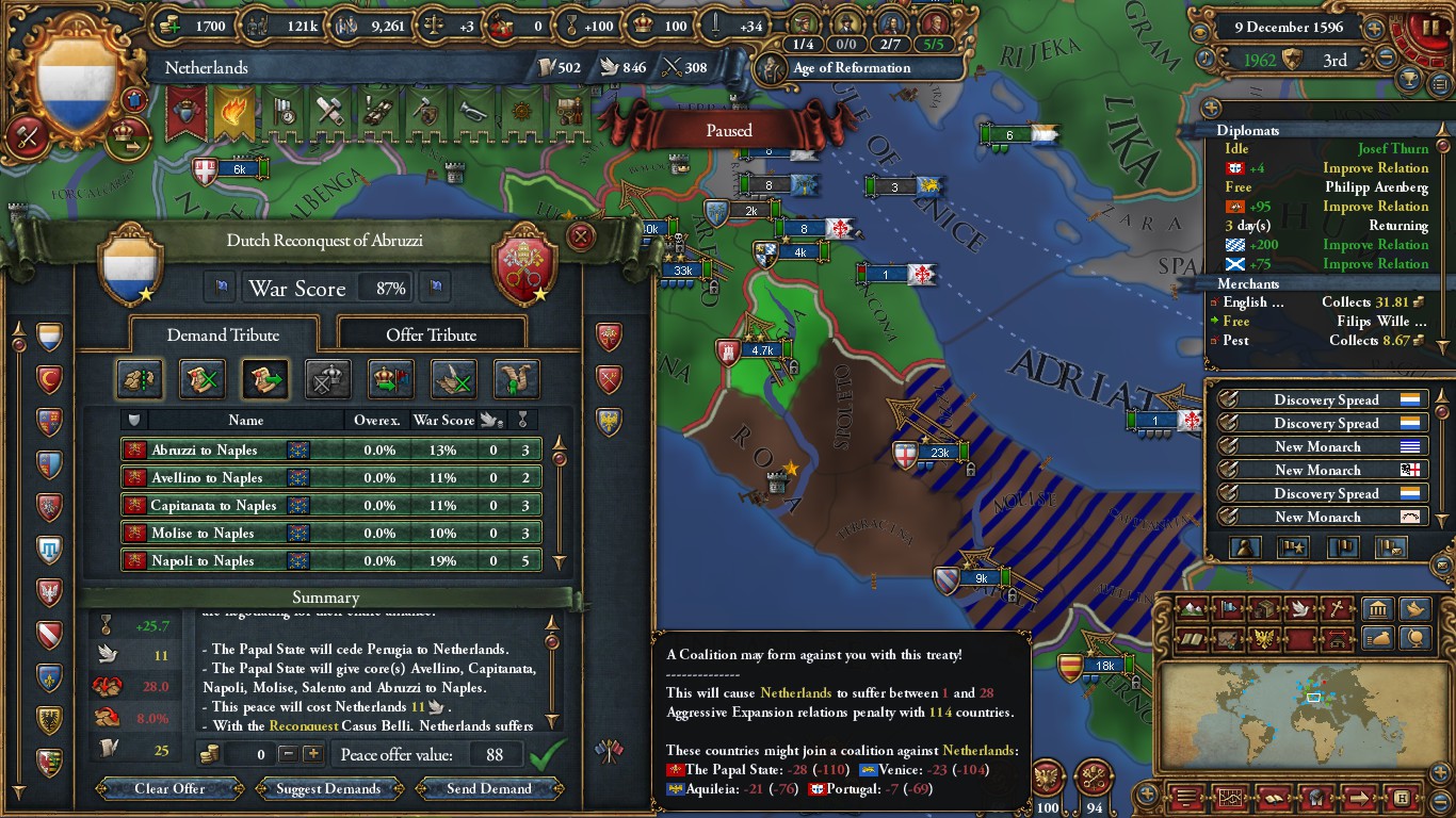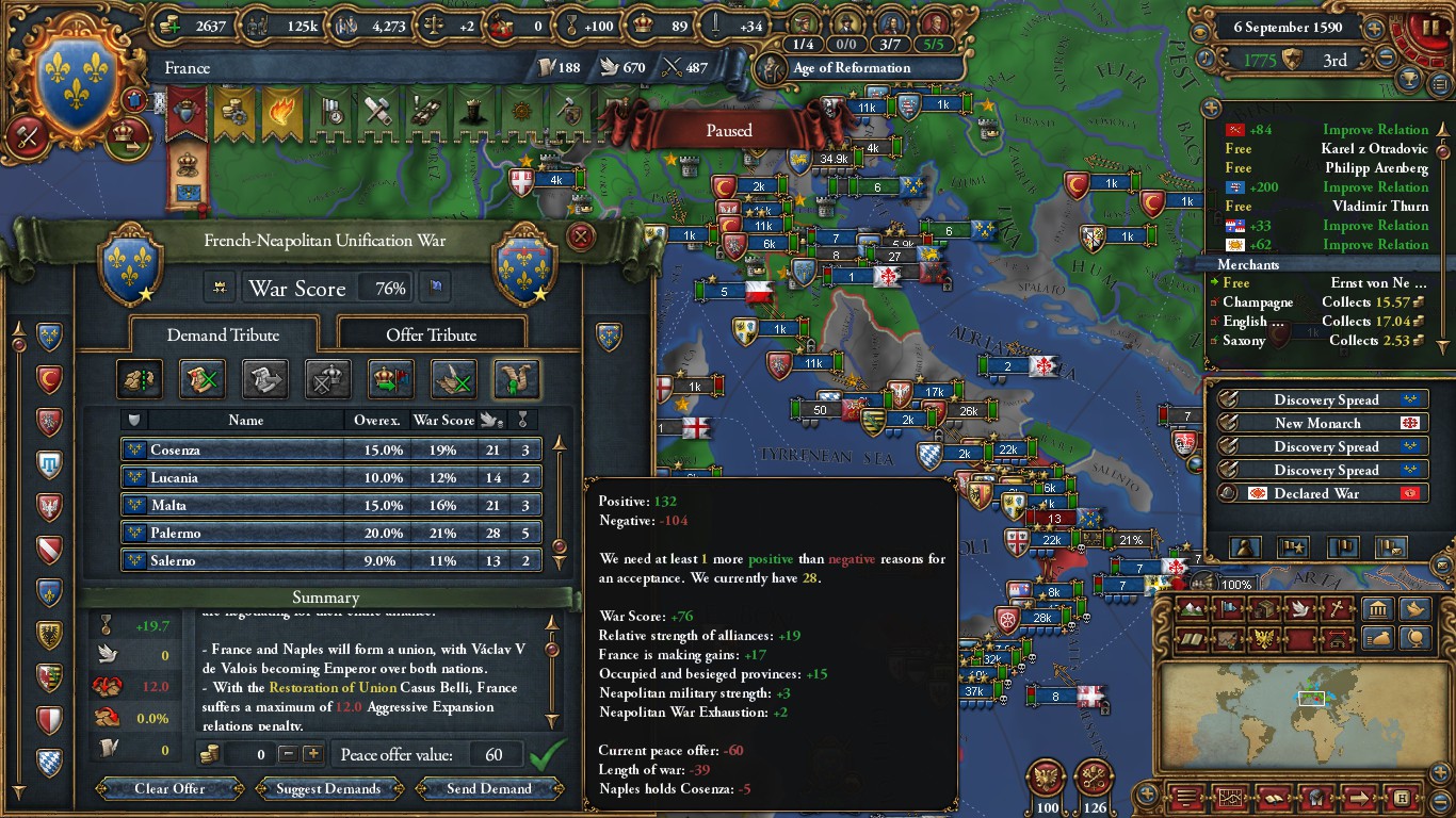 各君主点の総量は統治725,外交1175,軍事675で2575も得た。