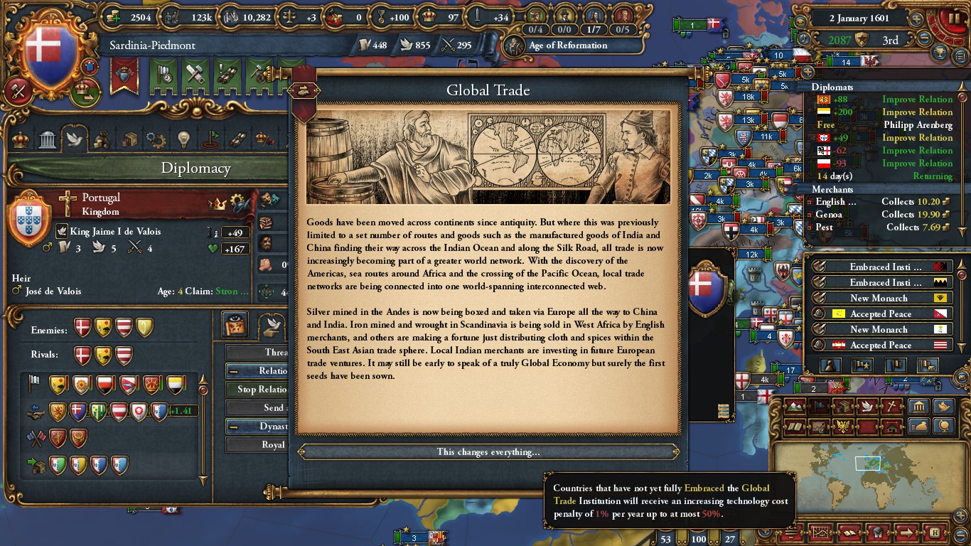 | サルデーニャ | 100 | 50 | 150 | 統治効率+5% 布教強度+2% 外交併合-10% 交易品生産量+10% | 君主と後継者の外交+1(達成時) | ||||||