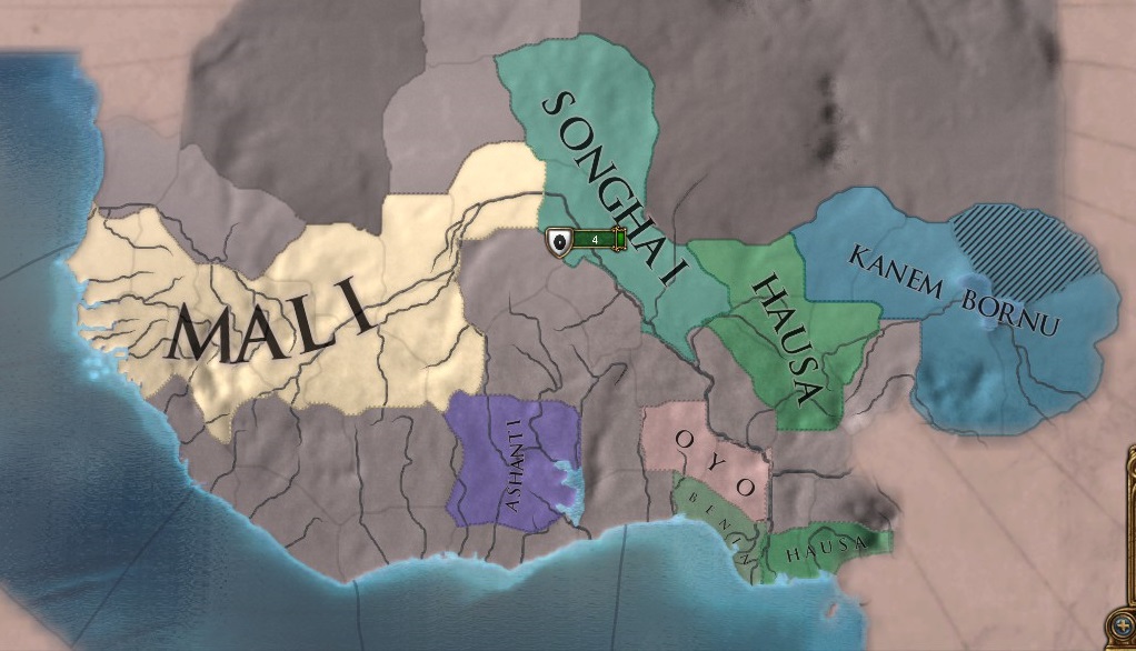 約120年前、ガオの地はマリ王国のマンサ・ムサに征服され、旧ソンガイ帝国はマリ王国の支配下に置かれた。しかし、近年、マリ王国内部でいざこざが絶えず地方に目を向ける余裕がなくなったため、スンニ・マラカナはどさくさに紛れてガオ周辺を制圧しソンガイ帝国を再興したのだ。とはいえ、マリ帝国はまだまだ強大である。ここは同盟者の顔をしながら国の存続を図るのが賢明なやり方と言えよう。