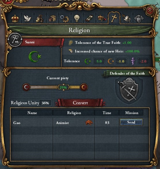 スタート直後のソンガイ帝国は実に弱小国である。国土は3州しか保有しておらず、軍事力などマリ王国の1/3以下である。史実では、この時期にマリ王国の首都を攻撃したらしいが、とてもそんなことができる状態ではない。何事も地道にということか。