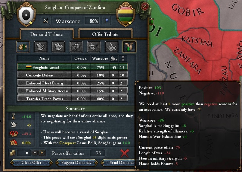 スンニ・マラカナの後を継いだスンニ・ダウドは、ハウサ諸国遠征を続行した。主力部隊のいない内陸部の制圧に時間はかからず、1451年、内陸部の全ての部族は降伏した。もはや勝てぬと悟ったハウド諸国は、再三にわたりザンファラ、カツィナ、ゴビールの割譲を打診する使者を送ったが、スンニ・ダウドはそのたびに使者を追い返した。彼が狙っていた講和条件はそのようなものではなかった。ハウド国内が長引く占領に疲弊し厭戦ムードが高まったときに、ソンガイ帝国は使者を送った。それは属国になることを要求するものであった。ハウサ諸国にこれを拒否する力はもはやなく、1452年、ハウサ諸国はソンガイ帝国の属国となった。