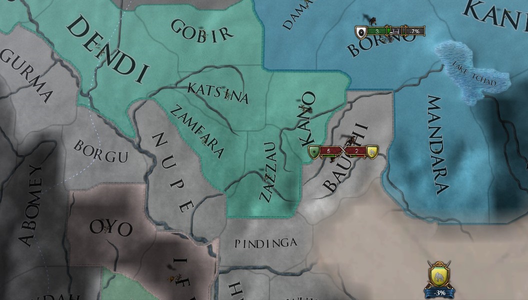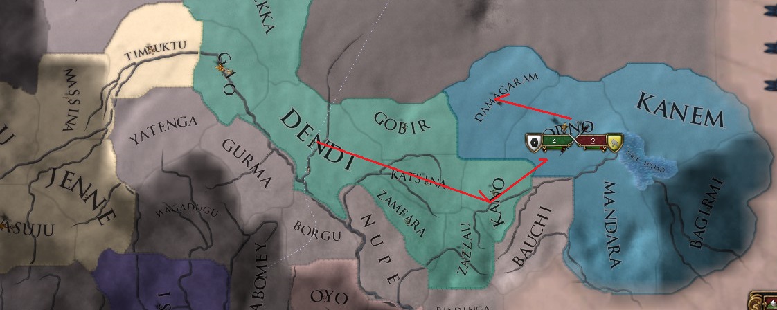 カービフォ率いるソンガイ帝国とカネム・ボルム帝国軍は首都ボルノで激突、結果はソンガイ軍の圧勝に終わった。カネム・ボルノの残存兵は密林地帯を経由しカノを攻略しようと考えた。しかし、諸族に襲われ全滅した。