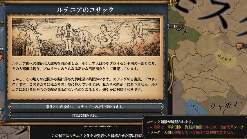 その中でコサック階級忠誠60%↑特権5個↑を満たしている場合、イベントの選択肢として騎兵比率+50%・騎兵コスト-10%を得る事が出来るようになります。