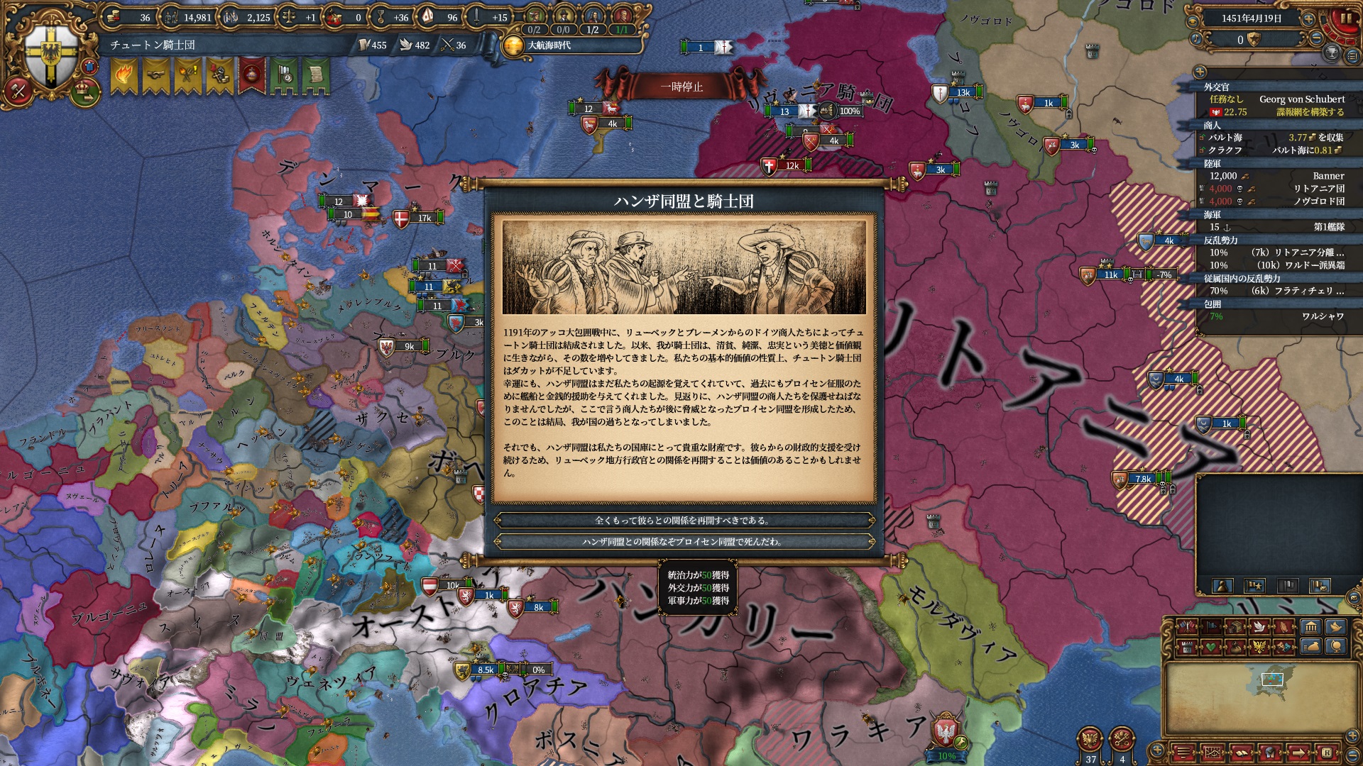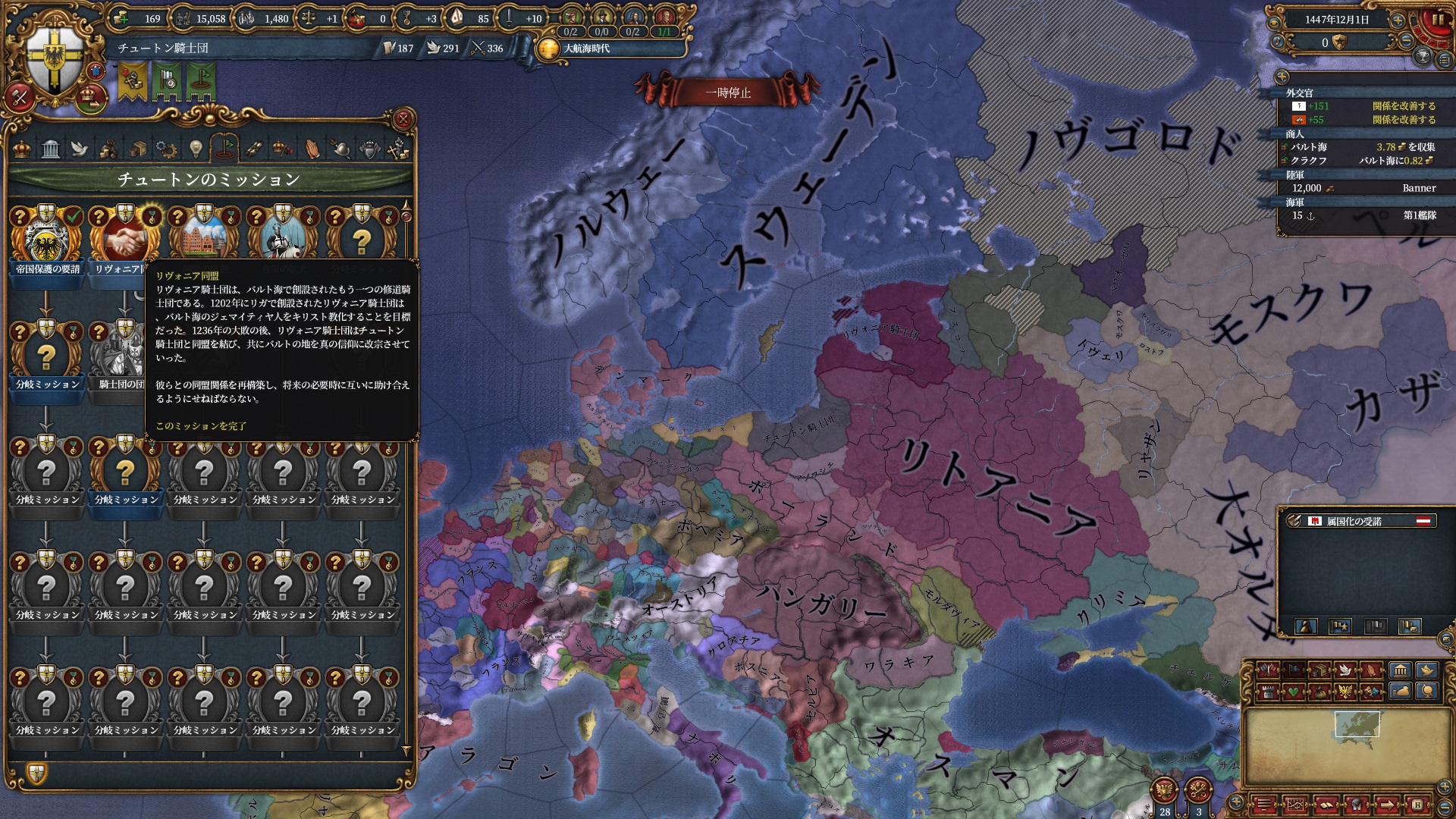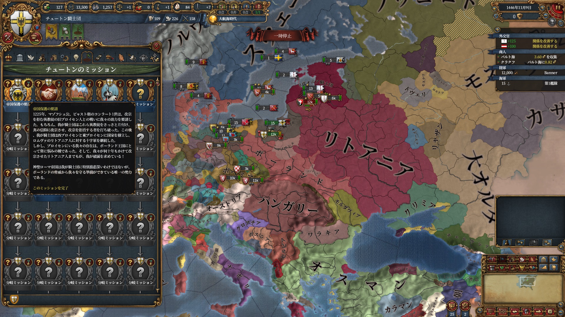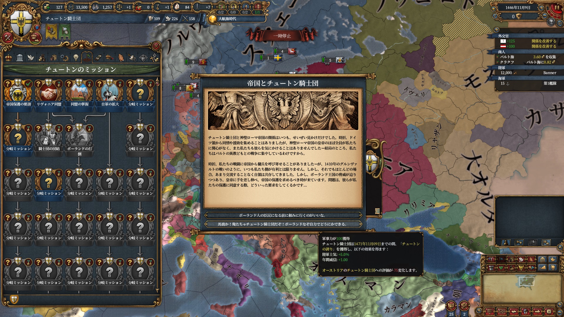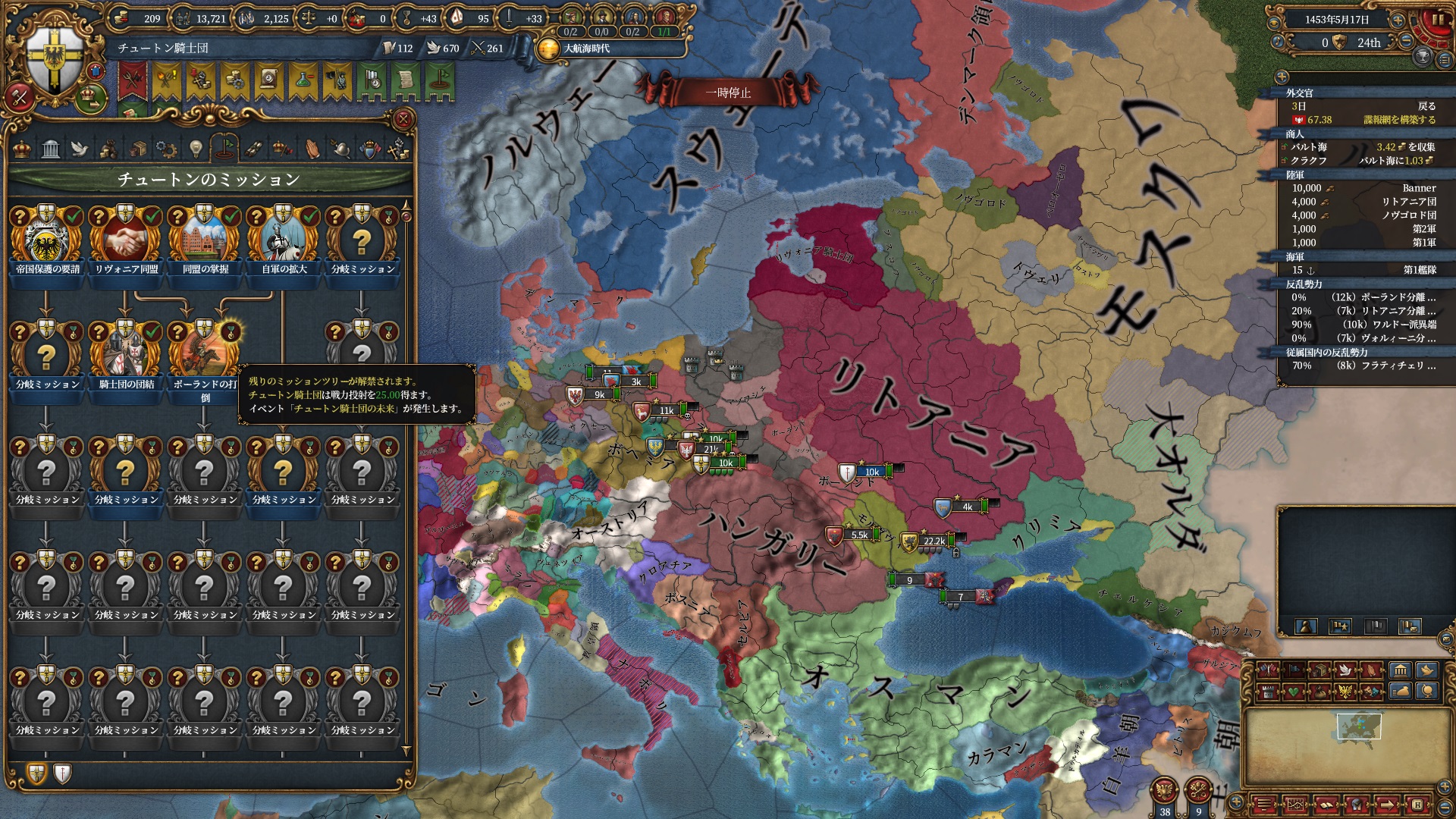 上でも述べましたが、チュートン騎士団のダンツィヒ周りの崩壊イベントはミッション"同盟の掌握"達成で反乱が抑制できるようになりました。