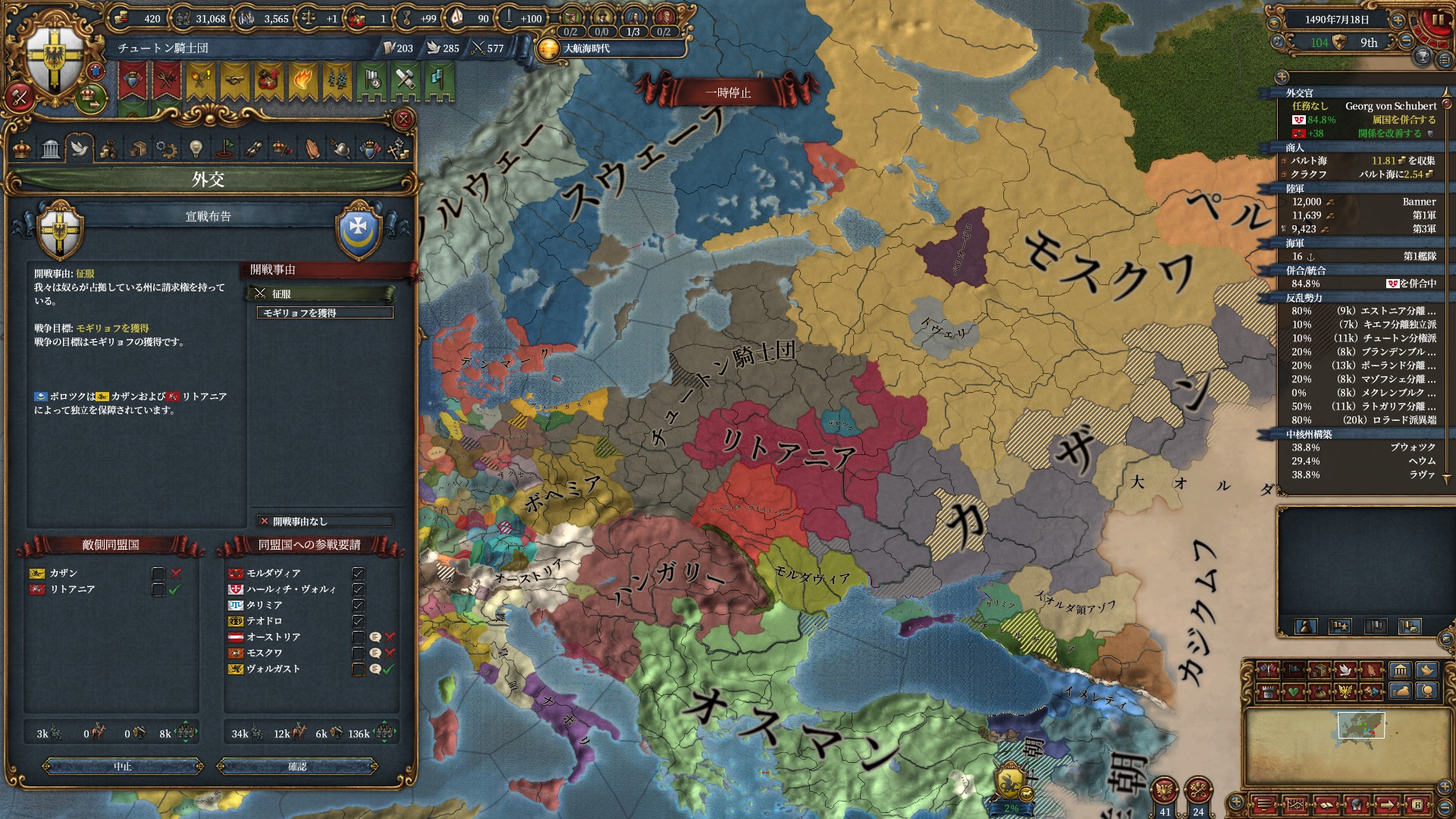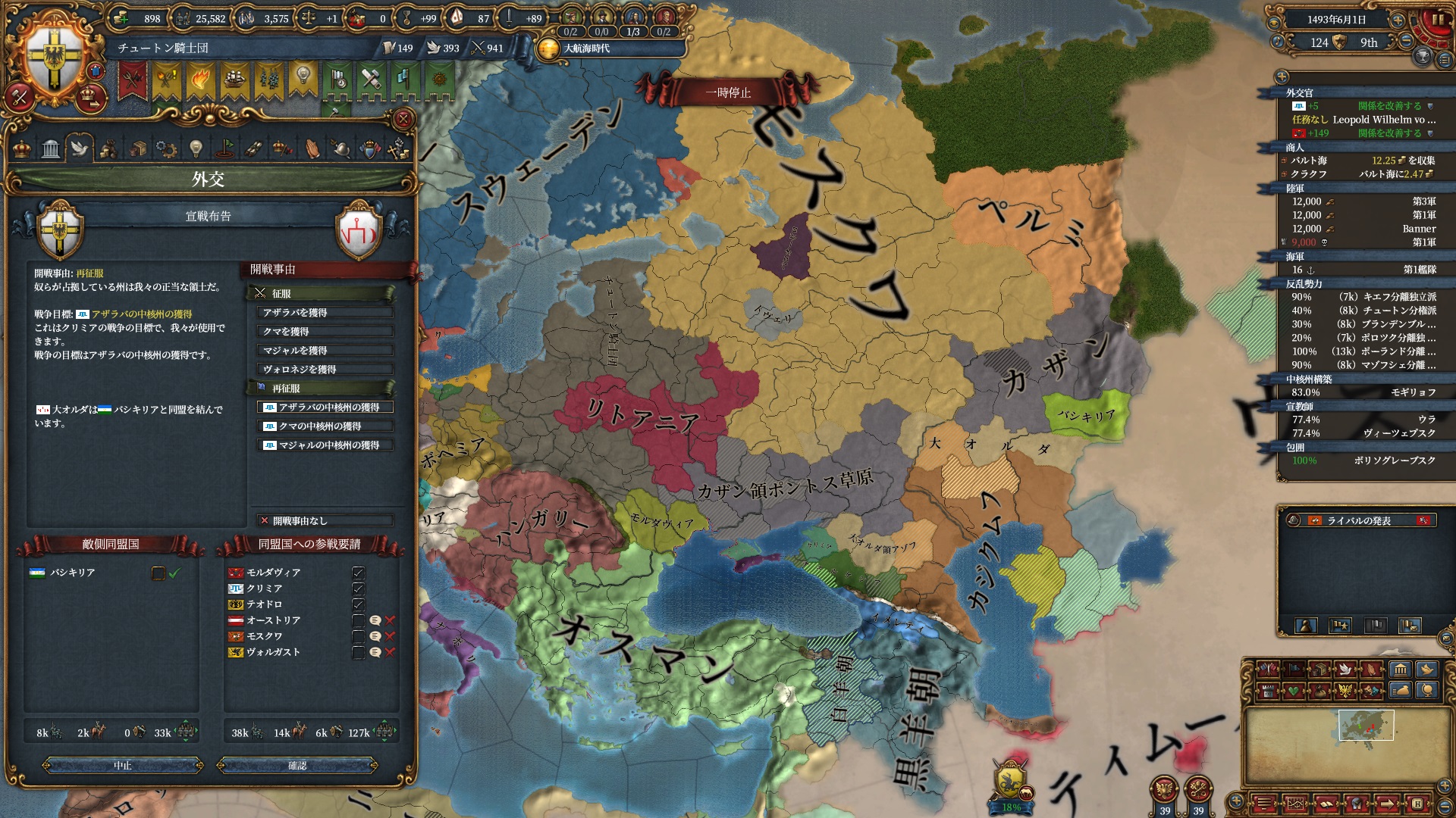 早速再征服CBで宣戦、というかモスクワがリトアニア戦後にカザンに対して戦争を始めているので、自国が呼ばれる前にこちらは個別に宣戦します。