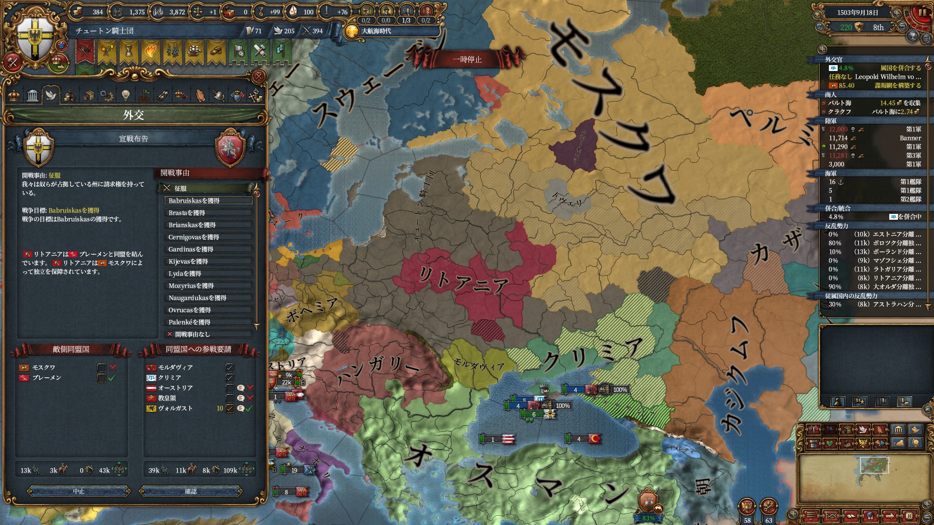 ポーランド相手ではfavor不足でモスクワが来てくれないので、宣戦布告対象はリトアニアにしてモスクワは領土約束で呼び出します。