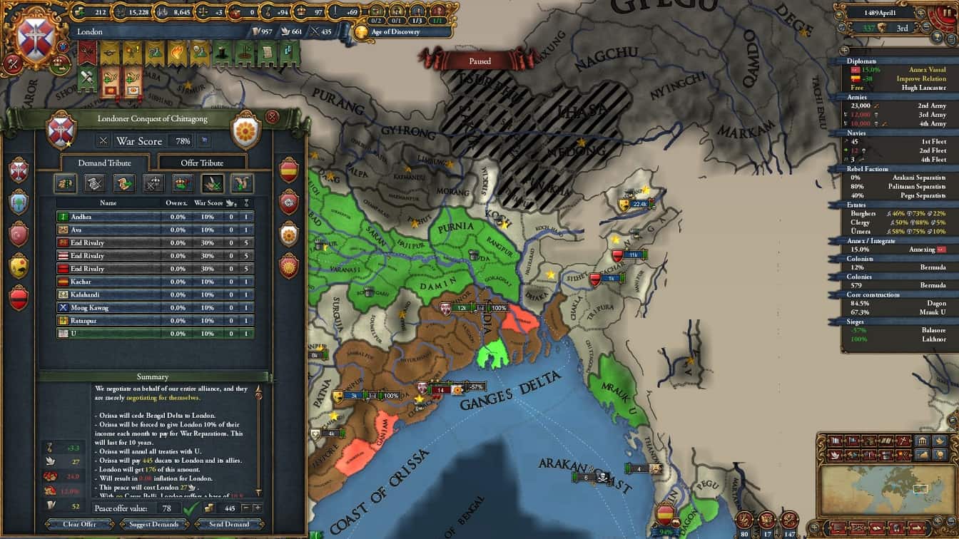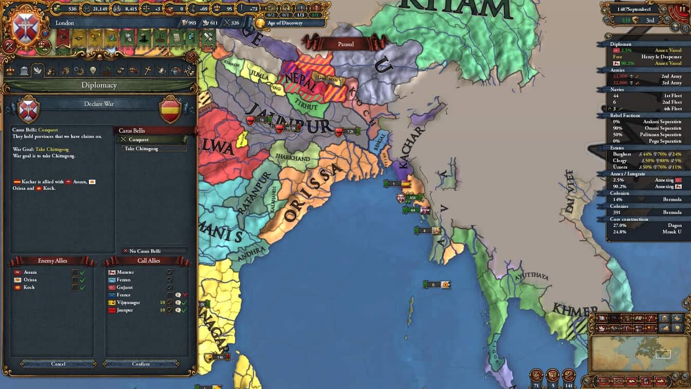 今回はたまたまPeguが弱体化し同盟も持っていなかったため、これ幸いとインド東部に前線を築くことができました。