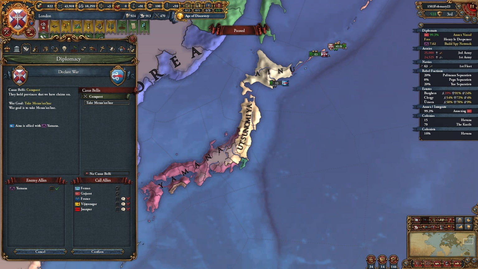 幕府を乗っ取ったYamanaとその旧同盟国Utsunomiyaがほぼ全土を抑えていることで逆に戦力が低下した日本は敵ではなく、翌1504年にMusashiの割譲をもって旧大陸での戦闘は完了となります。