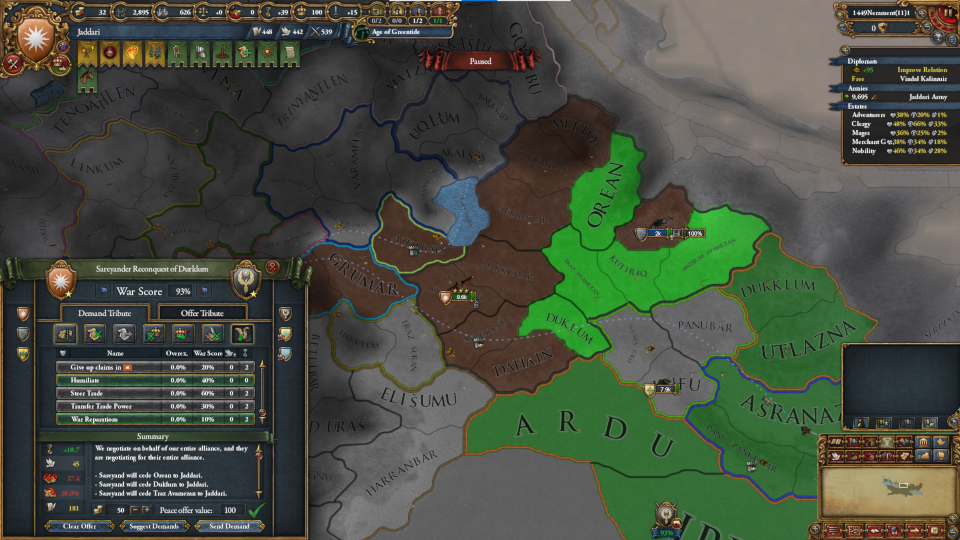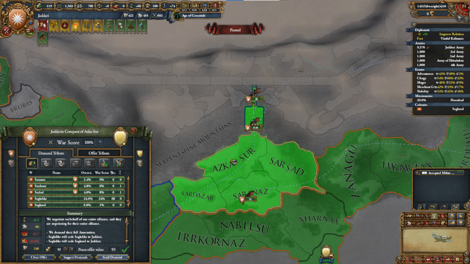 時間を進めると騎兵の徴兵が完了し、ミッション「軍団の招集」を達成、ゾッカ部族領、アズカ=スール王国領に恒久請求権を得ます。ですが、こちらからはしかけません。ゾッカ部族は属国二つと初期同盟国二つをもち、単体の軍量でもこちらを上回っていますので、まず勝てません。