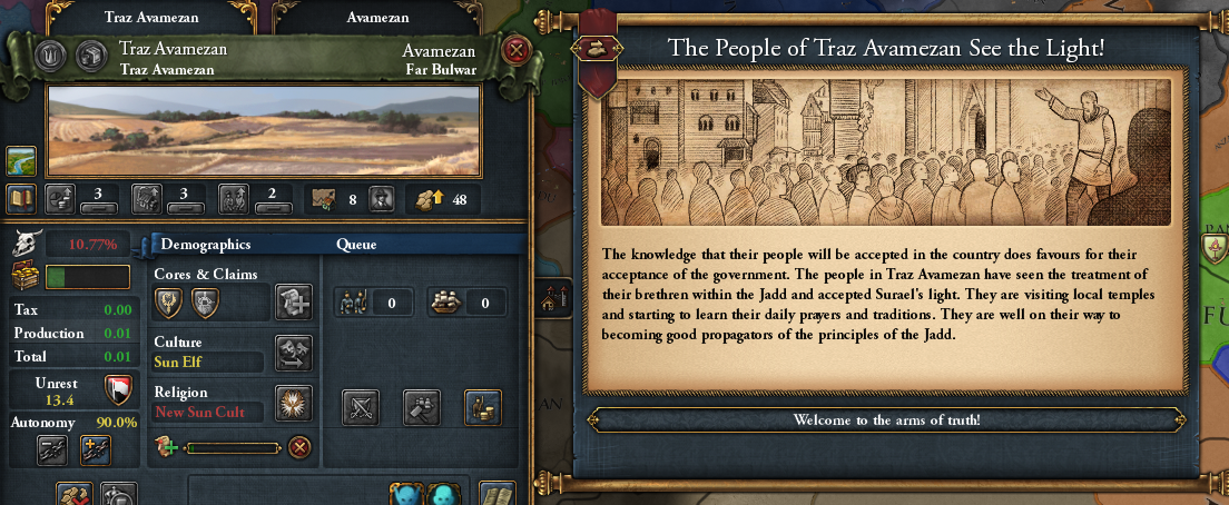 ジャッドが国境である場合、時々このようなイベントが発生します。このイベントはその州がジャッドに改宗するイベントではありますが、見ての通りコア化中の州でも発生しますし、交易会社の州や宗教的情熱の付いた州でも発生します。しかもそこそこの頻度で発生するので、序盤から中盤の改宗がかなり助かります。