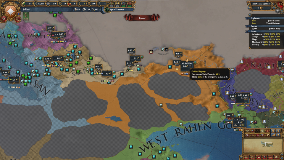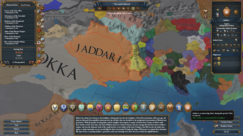 この国がひとまず目標にすべきなのは「ジャッド帝国」の建国です。ジャッド帝国は西のブルワールからアズカ=スール・サレヤンド・ブルワールの3州、東のラヘンからデニジャンサール・ラヤブハシャパル・サルディファディンの3州をすべて確保したうえで、ブルワール及びラヘンに150州領有することで変態できます。特にラヘンは情勢の変動が激しく、包囲網も組まれやすいので注意が必要です。