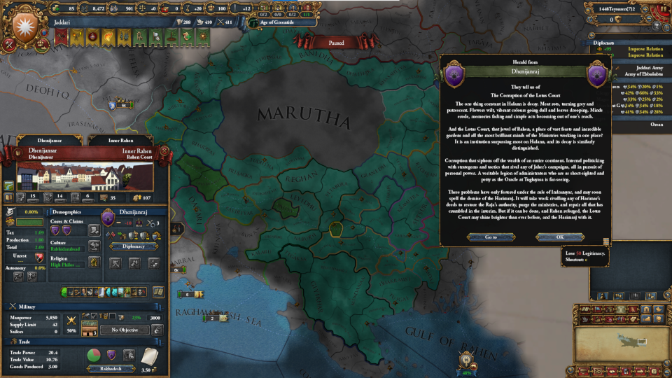 ジャダーリは国土14プロビの内、10が砂漠、3が沿岸砂漠、1が山岳(首都)とかなり地形的に問題のある地に位置しており、国力も貧弱です。しかし、この国には大拡張をサポートする様々なシステム、イベントがあり、ミッションでは最終的には大陸のほぼ全土を領有し、ジャッドに改宗することを求められています。裏を返せば、それだけのことができる国であると言えます。