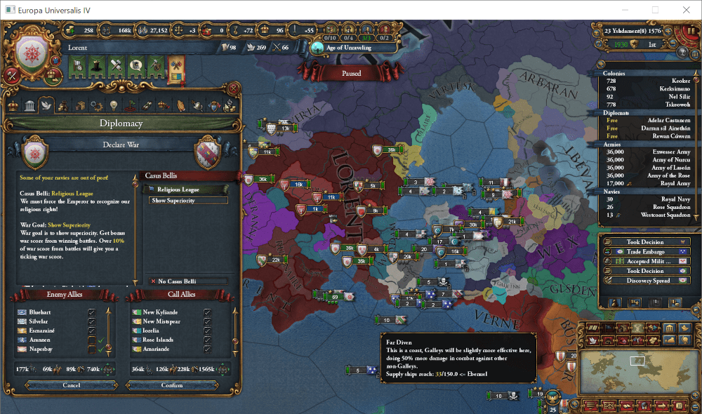 1528年6月、どうやら現Anbennar皇帝がCorinaiteに改宗したようです。現時点でAnbennar皇帝位に宗教的制約はないのでこのまま続きますが、帝国内の分断はさらに深まりそうです。