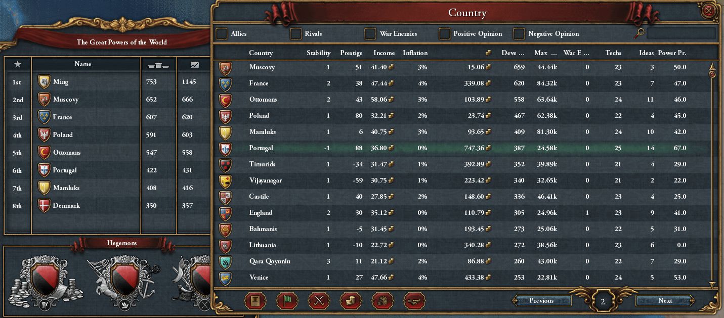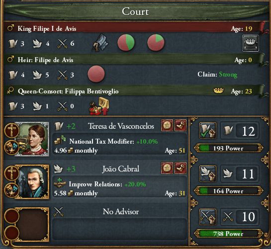 Castileが借金に苦しんでおり、FranceのFavorも使い切ったばかりなので、しばらく戦争の予定はない ただしまだ若いので、在位中に何回かはこの性格が幸いすることもあると思う ちなみに、Morocco戦/Aragon戦共に領土獲得後はすぐに自治率を上げ、不穏度を下げている どれほど小規模な反乱軍であろうと今のPortugal軍では勝てないので、反乱発生=要求受諾のようなもの